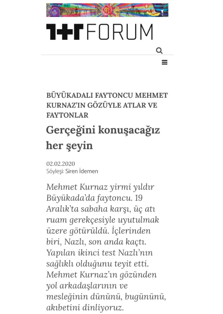 Mehmet Kurnaz yirmi yıldır Büyükada’da faytoncu. 19 Aralık’ta sabaha karşı, üç atı ruam gerekçesiyle uyutulmak üzere götürüldü. İçlerinden biri, Nazlı, son anda kaçtı. Yapılan ikinci test Nazlı’nın sağlıklı olduğunu teyit etti. Mehmet Kurnaz’ın gözünden yol arkadaşlarının ve mesleğinin dününü, bugününü, akıbetini dinliyoruz.