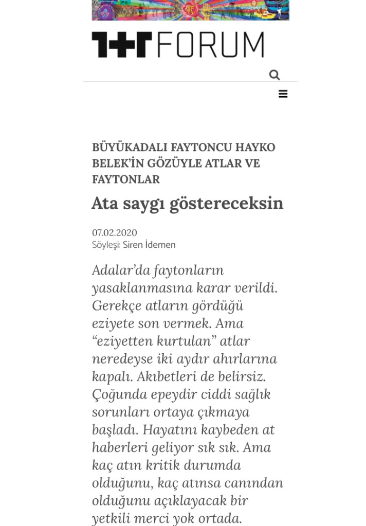 Adalar’da faytonların yasaklanmasına karar verildi. Gerekçe atların gördüğü eziyete son vermek. Ama “eziyetten kurtulan” atlar neredeyse iki aydır ahırlarına kapalı. Akıbetleri de belirsiz. Çoğunda epeydir ciddi sağlık sorunları ortaya çıkmaya başladı. Hayatını kaybeden at haberleri geliyor sık sık. Ama kaç atın kritik durumda olduğunu, kaç atınsa canından olduğunu açıklayacak bir yetkili merci yok ortada. Atların vaziyetini, mesleği tarihe karışmak üzereyken ruh halini sormak üzere kırk küsur yıllık faytoncu Hayko Belek’in kapısını çaldık. Meğer, karantina adı altındaki hapislik döneminde onun atlarından biri de önce yavrusunu düşürmüş, sonra hayatını kaybetmiş. Yok olan mesleğin dününü bugününü Hayko Belek’ten dinliyoruz.