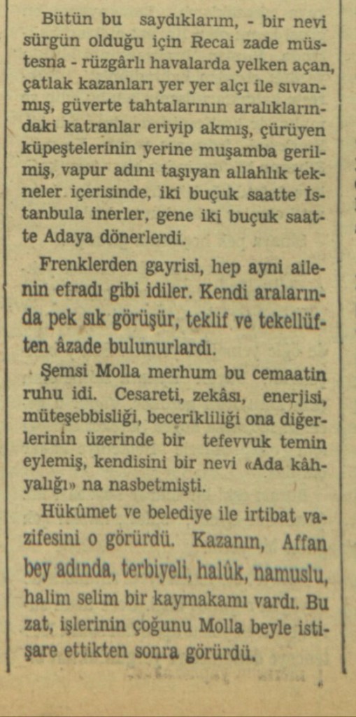 Bütün bu saydıklarım, –bir nevi sürgün olduğu için Recâizâde müstesna– rüzgârlı havalarda yelken açan, çatlak kazanları yer yer alçı ile sıvanmış, güverte tahtalarının aralıklarındaki katranlar eriyip akmış, çürüyen küpeştelerinin yerine muşamba gerilmiş, vapur adını taşıyan allahlık tekneler içerisinde, iki buçuk saatte Ada’ya dönerlerdi.
