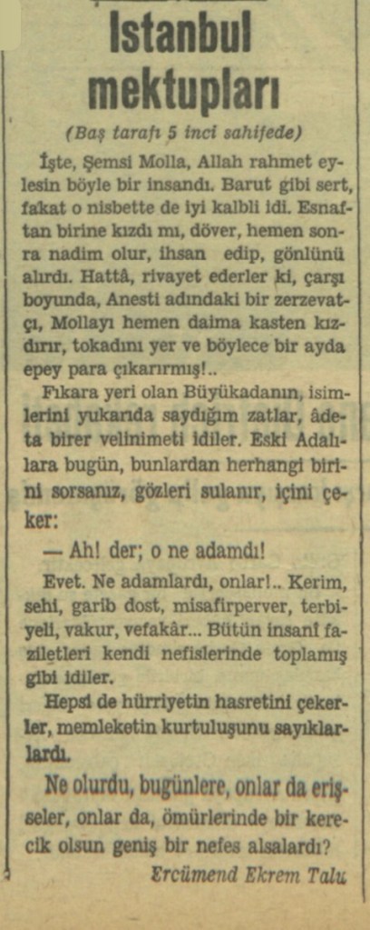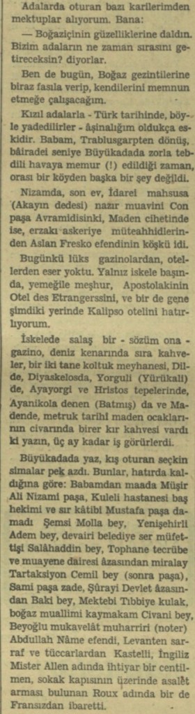 🔘 Ercümend Ekrem Talu, “İstanbul Mektupları: Biraz da Adaları Gezelim”, Akşam, 26.8.1937.