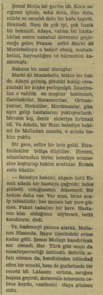 Şemsi Molla bir garibe idi. Koca sarığının içinde, zekâ dolu, ilim dolu, nükte ve zarafet dolu bir kafa taşırdı. Hekimdi. Hem de çok iyi, çok hazik bir hekimdi. Ada’ya, vahim bir hastalıktan sonra nekahat devresini geçirmeye gelen Fransa sefiri Marki dö Montebello’yu o tedavi etmiş, muhabetini, hayranlığını ve hürmetini kazanmıştı.