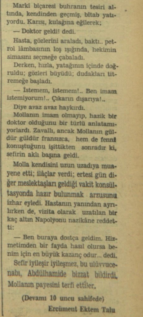 Molla’nın imam olmayıp hazik bir doktor olduğunu bir türlü anlatamıyorlardı. Zavallı ancak Molla’nın güldür güldür Fransızca, hem de fenni konuştuğunu işittikten sonradır ki, sefirin aklı başına geldi.