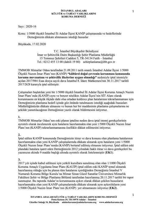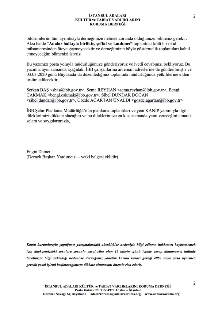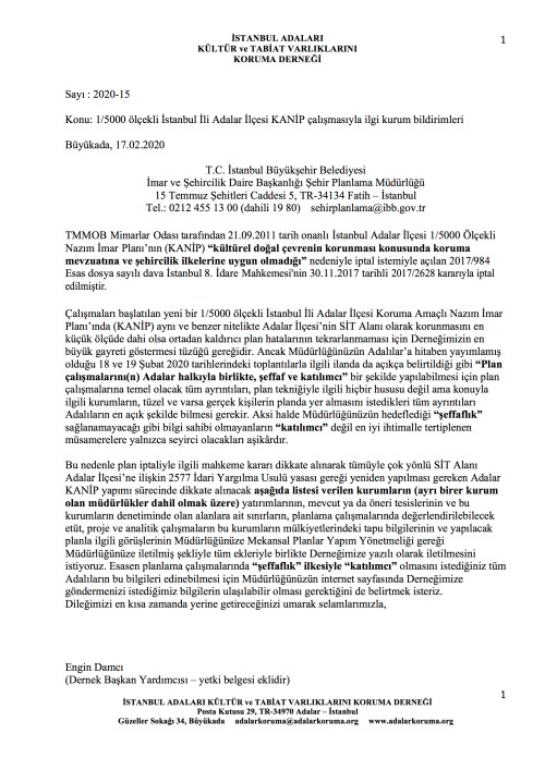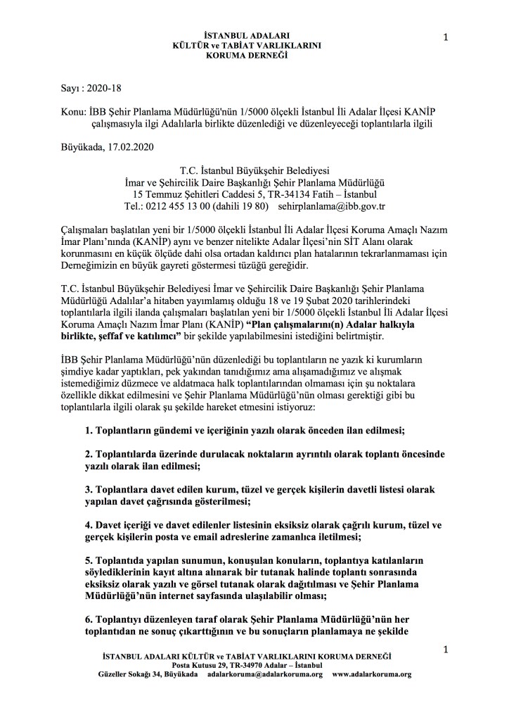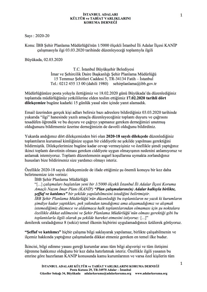 İBB Şehir Palanlama Müdürlüğü 3 Mart 2020 günü saat 13:00’te Büyükada’da Adalar Belediye Meclisi salonunda KANİP çalışmaları için ikinci bir toplantıya davet ediyor. İAKTVKD toplantının eksikliklerini bildiren bir yazıyı ilgili müdürlüğe ve toplantıyı düzenleyen müdürlük çalışanlarına postayla ve elden iletecek. Yazının içeriği son derece açık olduğu için bu yazının ekinde Adalılar’ın bilgisine sunmakla yetineceğim. Aynı müdürlüğün 18 ve 19 Şubat 2020 tarihlerinde aynı konuda dört adada düzenlediği ilk toplantılar için İAKTVKD dört dilekçe sunmuştu. Bunları da bu yazının ekinde Adalılar’ın bilgisine sunuyoruz.