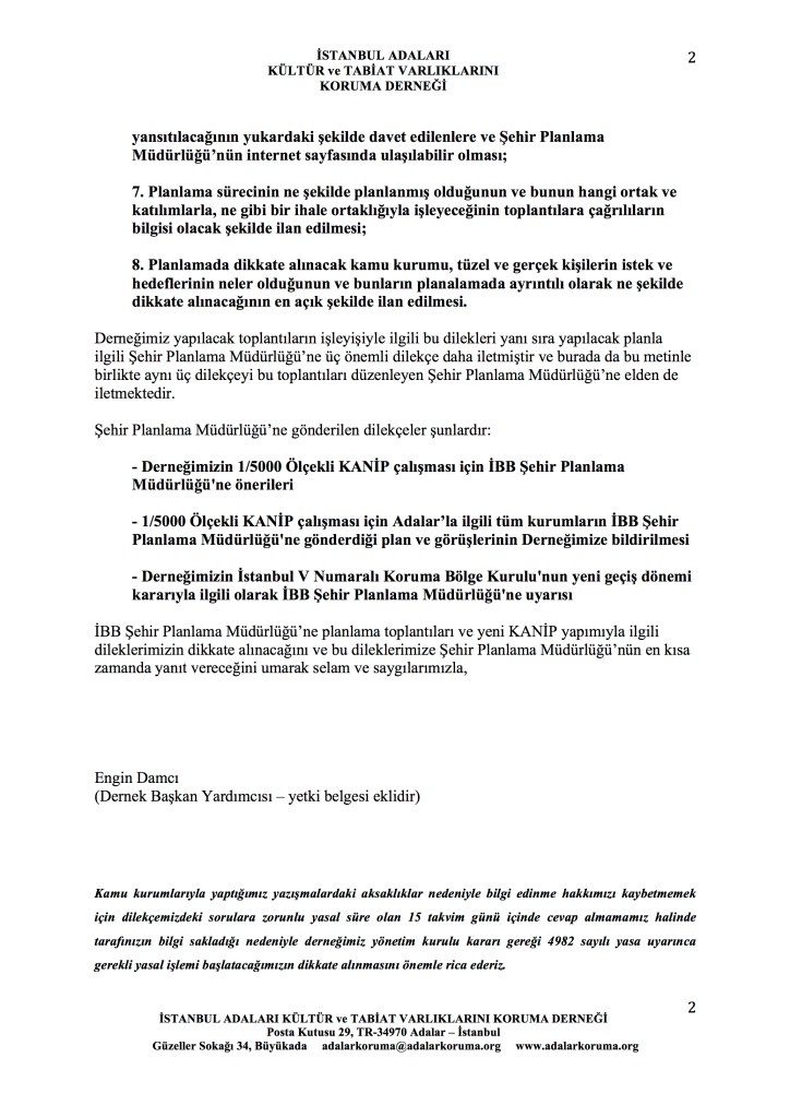 İkinci önemli husus KANİP’in hangi kamu kurumlarının ihtiyaçlarını giderecek şekilde yapılacağının bilinmesidir. Milli savunma gibi askerî stratejik önemi olan bilgiyi istemiyoruz ama Adalar’da payı olan 42 kurumun Adalar için yapılacak plandan ne beklediğini, ne istediğini bilmek istiyoruz. Bu kurumların hepsi halkın hizmeti için halkın parasıyla kurulmuş ve çalışan kamu kuruluşlarıdır (Milli Eğitim Müdürlüğü, Orman İşletmesi, İtfaiye, Şehir Hatları gibi) ya da AYEDAŞ, İDO gibi kamu hizmeti veren özel kuruluşlardır. Adalılar’ın hazırlanan KANİP’te bu kuruluşların ne ihtiyaçları olduğunu, ne planladıklarını bilme hakkı vardır. Dolayısıyla bir dilekçeyle de Şehir Planlama Müdürlüğü’nün bu bilgileri derneğimizle ve hatta internet sayfasında tüm Adalılarla paylaşmasını istedik.