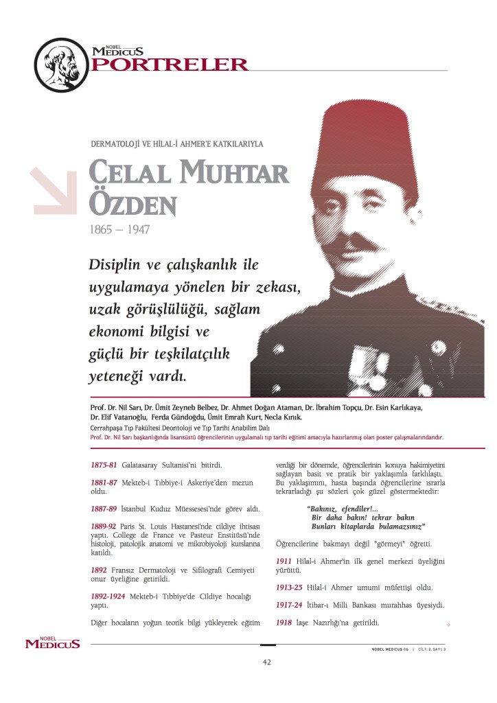 Dr. Celâl Muhtar Özden, Celâleddin Muhtar “Celâl” Özden 1865 yılında İstanbul’da doğmuştur. Dermatofitler üzerine çalışmalarıyla tanınan askeri ve sivil Türk dermatolog. Mustafa Kemal Atatürk’ün doktorlarından Prof. Dr. Akil Muhtar Özden’in ağabeyidir. Avrupa’da ‘Djèlaleddin Moukhtar’ diye tanınmıştır. Osmanlı Devleti ve Cumhuriyet tarihinin önemli türk dermotolog hekimidir.