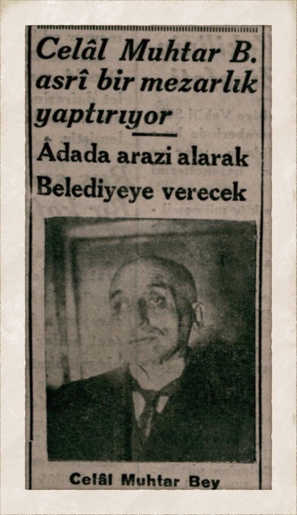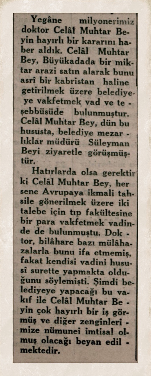 Yegâne milyonerimiz Celâl Muhtar Bey’in hayırlı bir kararını haber aldık. Celâl Muhtar Bey, Büyükada’da bir miktar arazi satın alarak bunu asrî bir kabristan haline getirilmek üzere bunu Belediye’ye vakfetmek vad ve teşebbüsünde bulunmuştur. Celâl Muhtar Bey, dün bu hususta, Belediye Mezarlıklar Müdürü Süleyman Bey’i ziyaretle görüşmüştür.