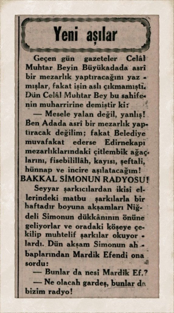 🔘 “Celâl Muhtar B. Asrî Bir Mezarlık Yaptırıyor Ada’da Arazi Alarak Belediye’ye Verecek”, Yeni Gün, 25.8.1931.