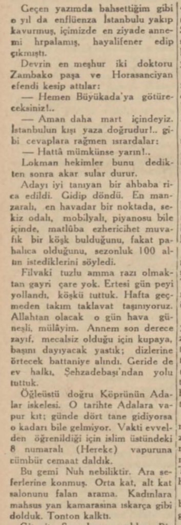 Filvâki tuzlu amma razı olmaktan gayri çare yok. Ertesi gün peyi yollandı, köşkü tuttuk. Hafta geçmeden takım taklavat taşınıyoruz. Alahtan olacak o gün hava güneşli, mülâyim. Annem son derece zayıf, mecalsiz olduğu için kupaya, başını dayıyacak yastık; dizlerine örtecek battaniye alındı. Geride de ev halkı. Şehzadebaşı’ndan yolu tuttuk.
