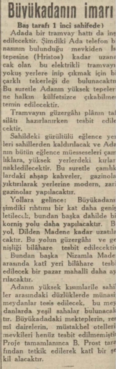 Büyükada’nın imar plânı etrafında tetkikler devam ediyor. Hattâ dün şehircilik mütehassısı Prost’un da iştirakile Büyükada’da bir de toplantı yapıldığını gazetelerde okuduk.