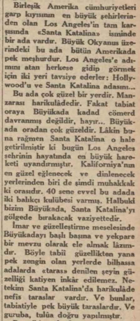 Bu ada çok güzel bir yerdir. Manzarası harikulâdedir. Fakat tabiat oraya Büyükada kadar cömert davranmış değildir, hayır… Büyükada oradan çok güzeldir. Lâkin buna rağmen Santa Katalina o hale getirilmiştir ki bugün Los Angeles şehrinin hayatında en büyük hareketi uyandırmıştır. Kalifoniya’nın en güzel eğlenecek ve dinlenecek yerlerinden biri de şimdi muhakkak ki orasıdır. 40 sene evvel bu Ada’da iki balıkçı kulübesi varmış. Halbuki bizim Büyükada, Santa Katalina’yı gölgede bırakacak vaziyettedir.