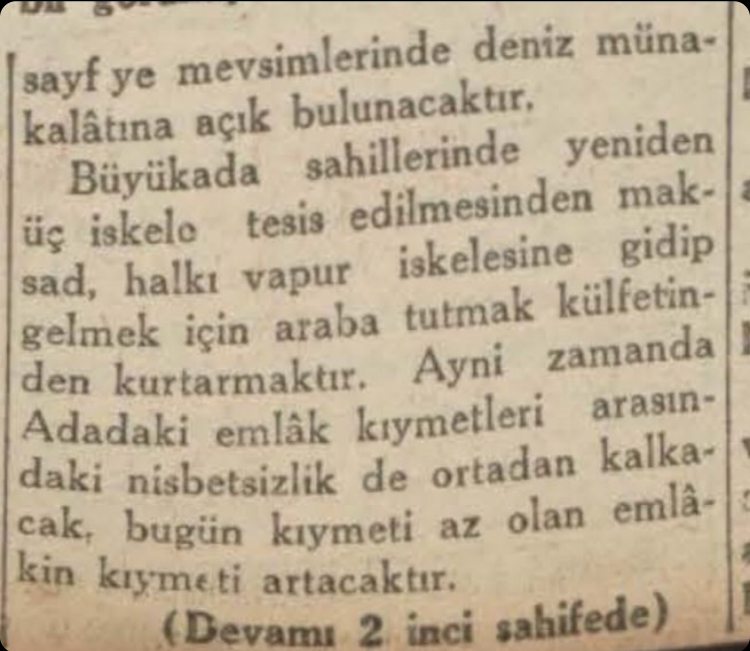 Büyükada sahillerinde yeniden üç iskele tesis edilmesinden maksat, halkı vapur iskelesine gidip gelmek için araba tutmak külfetinden kurtarmaktır. Aynı zamanda Ada’daki emlâk kıymetleri arasındaki nisbetsizlik de ortadan kalkacak, bugün kıymeti az olan emlâkın kıymeti artacaktır.