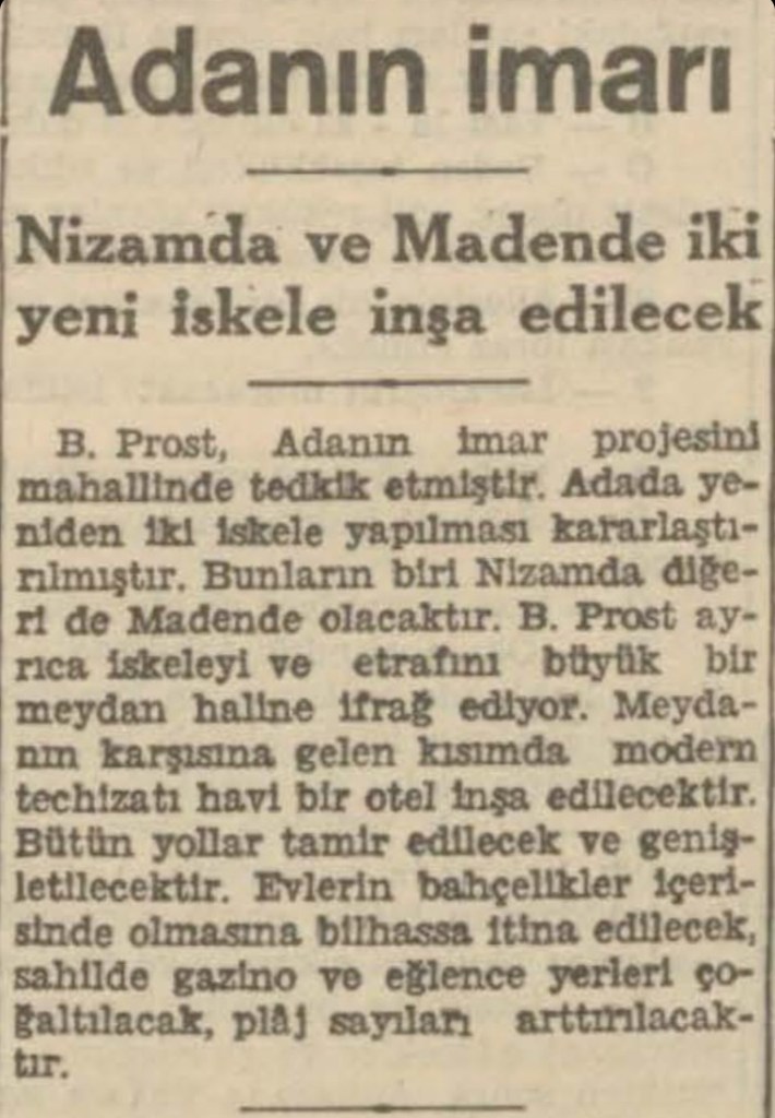 B. Prost Ada’nın imar projesini mahallinde tetkik etmiştir. Ada’da yeniden iki iskele yapılması kararlaştırılmıştır. Bunlardan biri Nizam’da diğeri de Maden’de olacaktır. B. Prost ayrıca iskeleyi ve etrafını büyük bir meydan haline ifrağ ediyor. Meydanın karşısına gelen kısımda modern teçhizatı havi bir otel inşa edilecektir. Bütün yollar tamir edilecek ve genişletilecektir. Evlerin bahçelikler içerisinde olmasına bilhassa itina edilecek, sahilde gazino ve eğlence yerleri çoğaltılacak, plâj sayıları artırılacaktır.