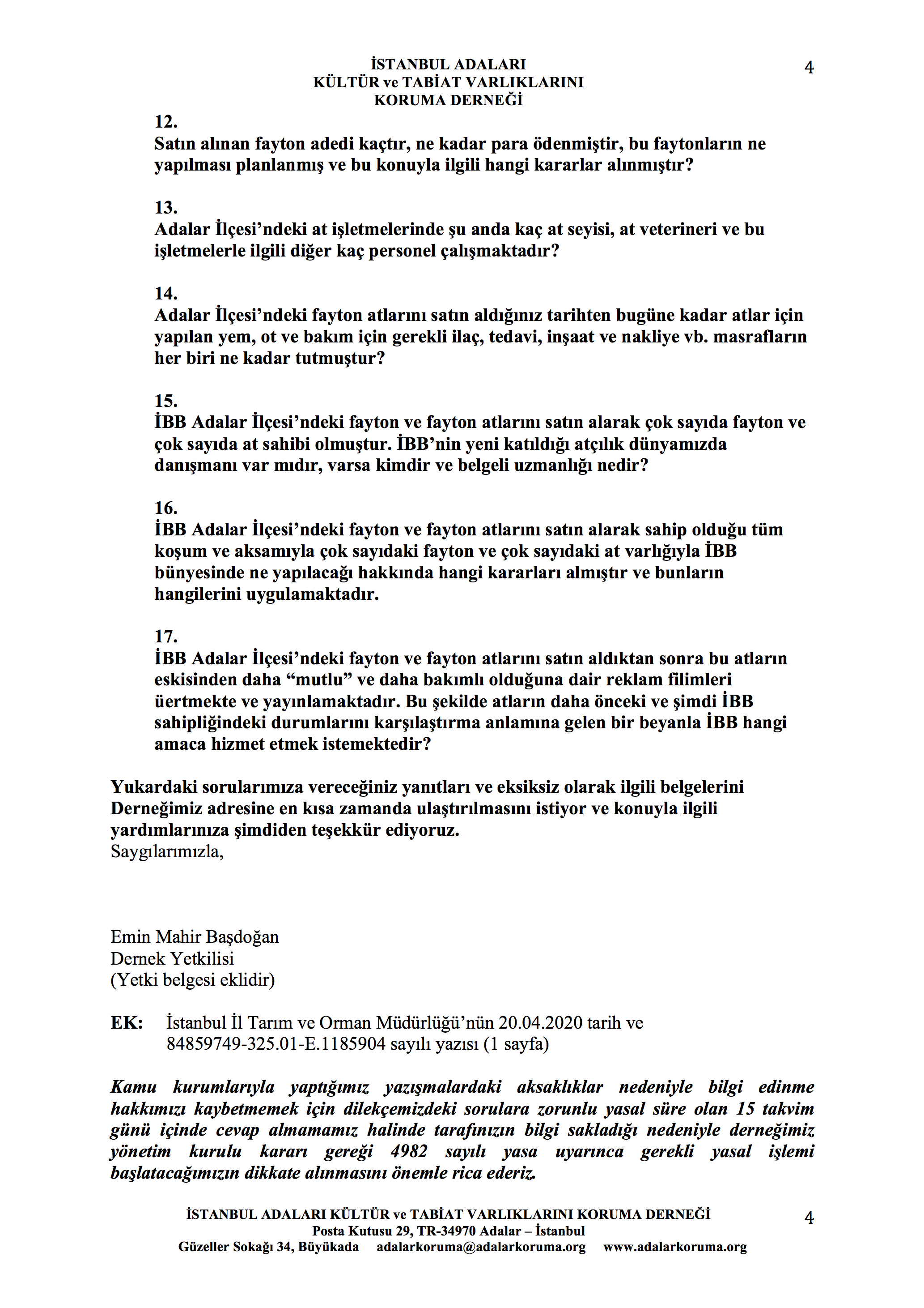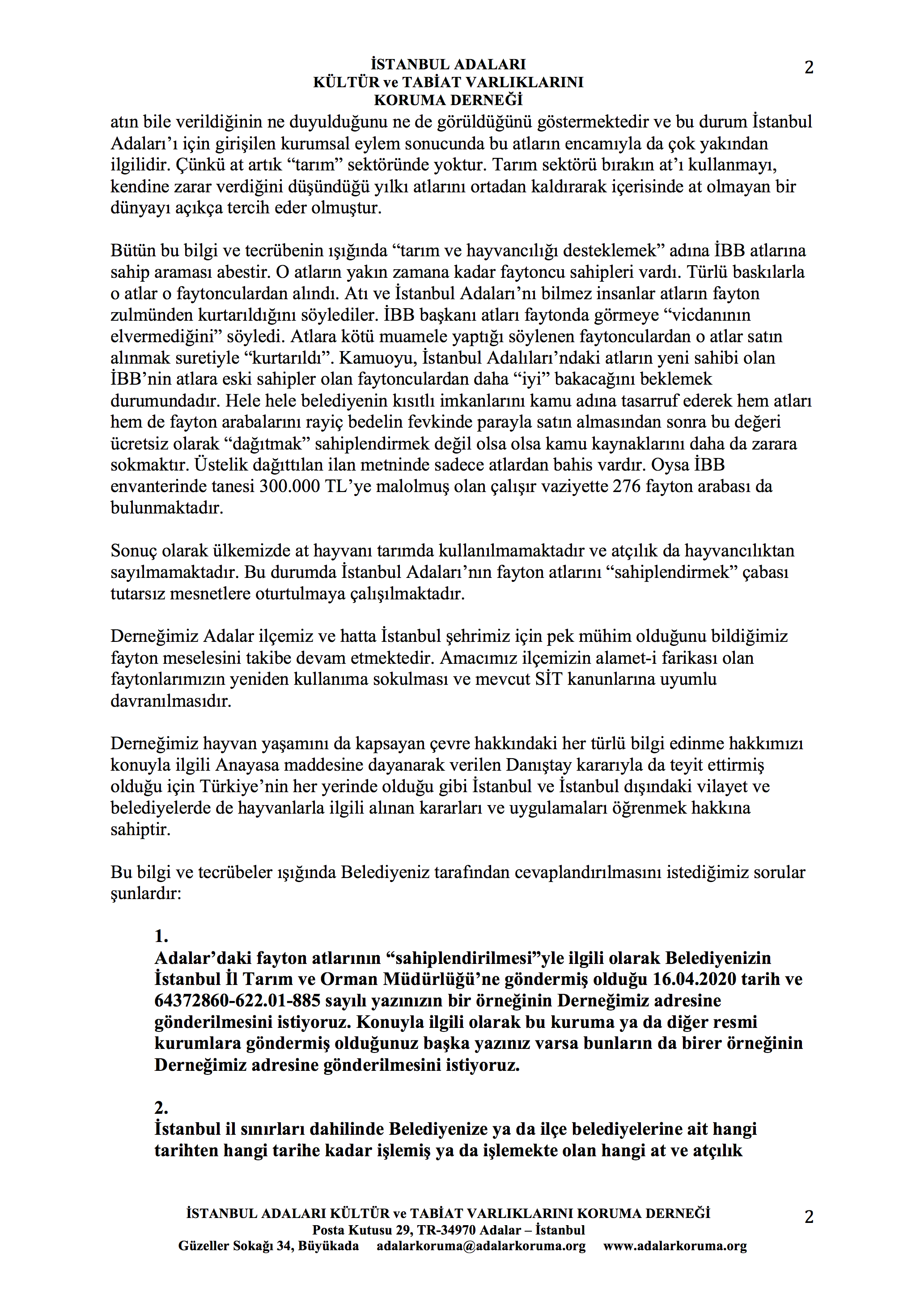 Adalar’da faytonu iptal, motorlu araç trafiğini ihya girişimi sonunda Adalar’ın fayton ve atları İBB üzerinde kalmıştır. İAKTVKD, İBB Başkanlığı’na bu operasyonda 90 milyon TL bütçe ayırarak satın aldığı atlar ve faytonlarla ilgili 17 soru yöneltmiştir.[Ek-1] İBB Başkanlığı bu sorulardan yalnızca bir tanesine yarım yamalak bir cevap verip diğer soruları cevapsız bırakmıştır. Derneğimize 28.05.2020 tarihinde ulaşan 20.05.2020 tarihli yazıyı ibret-i âlem için yayımlıyoruz.[Ek-2] Bu yazı CHP’li İBB yönetiminin başta Adalar halkını olmak üzere tüm İstanbulluları bir kez daha aldatmaya teşebbüsünün yüz kızartıcı bir belgesidir.