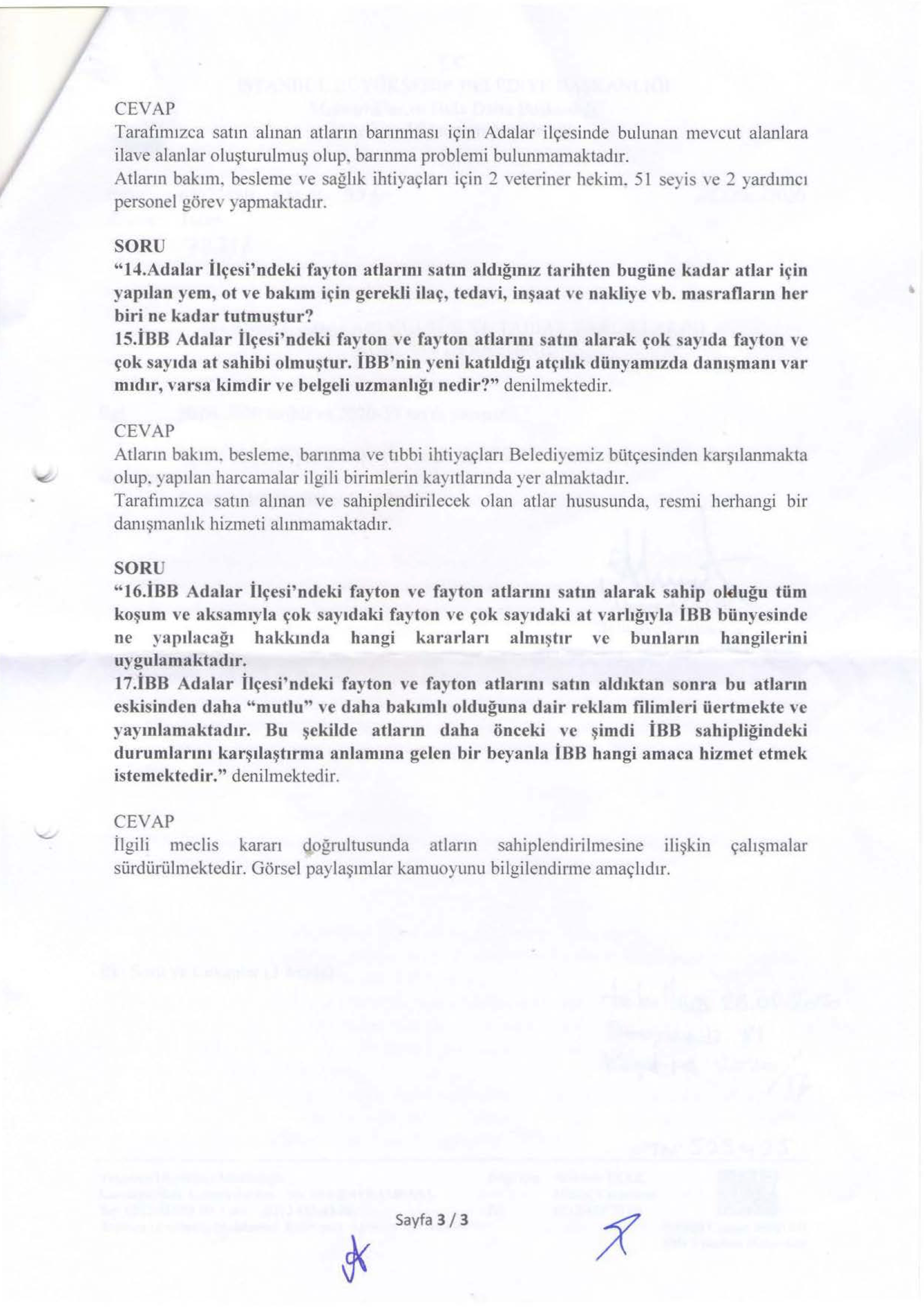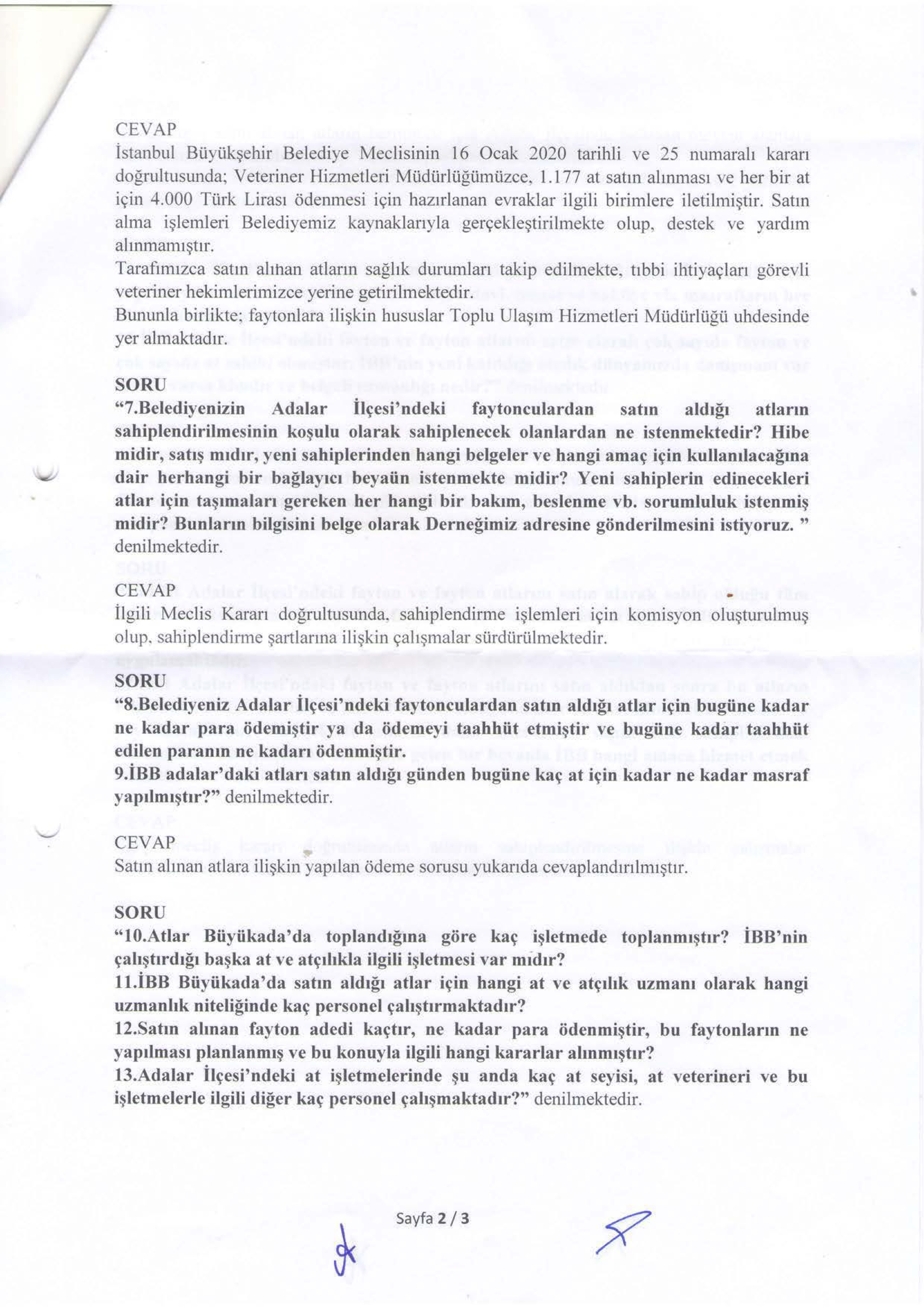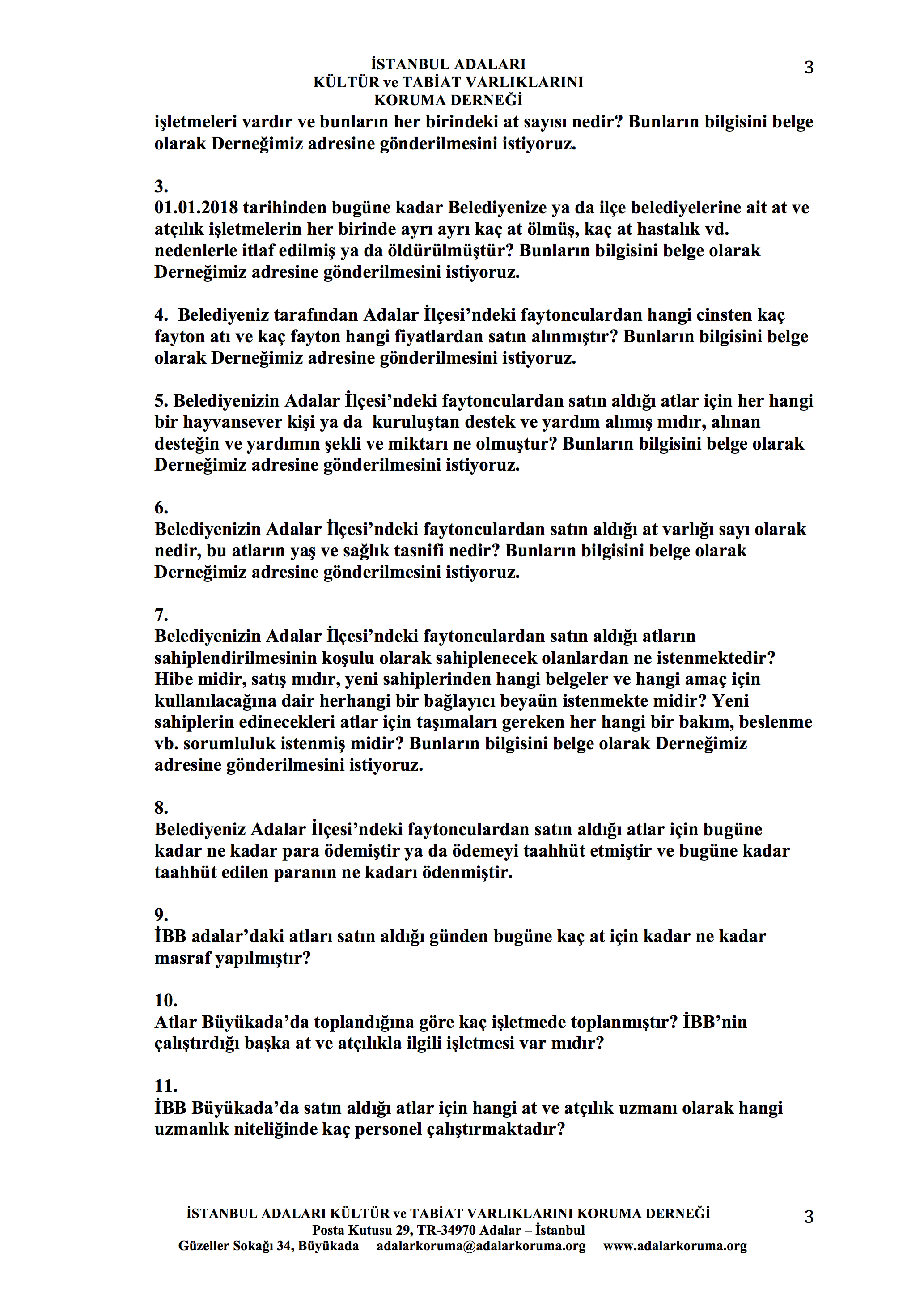 3) “El koyulduğundan beri kaç atın ölmüş kaç atın da hastalık sebebiyle itlaf edildiği” sorusuna cevap olarak bunu Adalar Belediyesi’ne sormamız gerektiği ve konuyla ilgili yetkilinin Tarım ve Orman Bakanlığı olduğu ifadesiyle hedef karıştırılarak bilgi saklanmıştır.