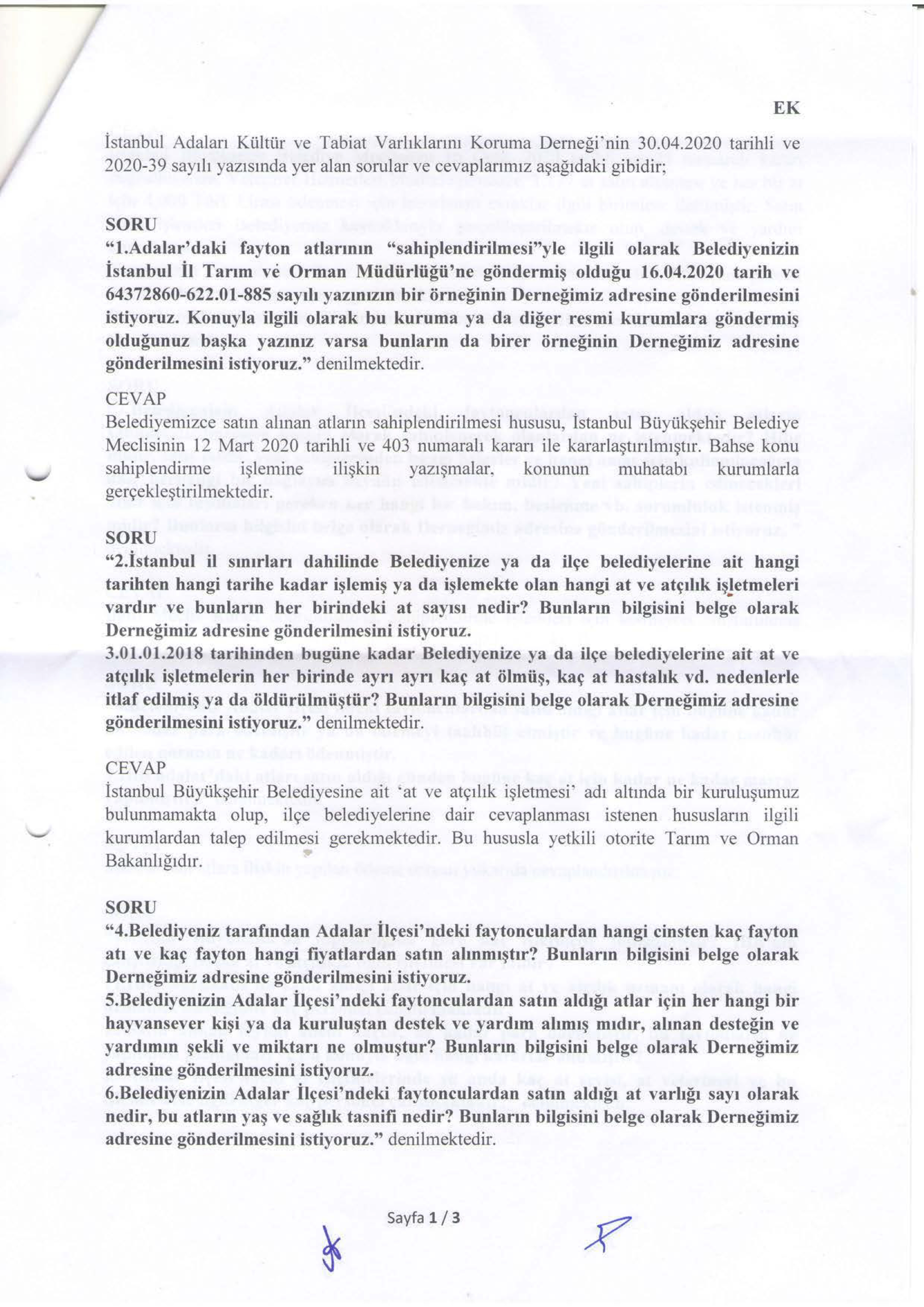 Atlar ve faytonlar hakkında İBB’ye verdiğimiz dilekçe konusuna dönersek, bu kurum bir çeşit cevap verir gibi yapıp aslında bilgi saklamıştır. Yakından bakınca görünen şudur: