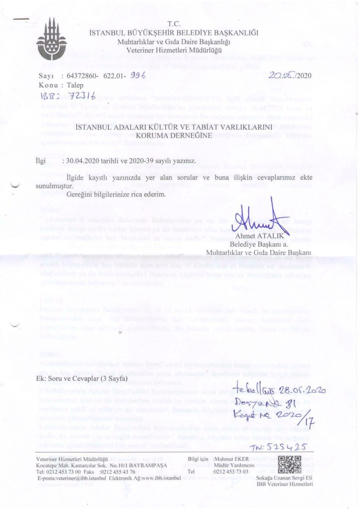 Kanunî süre içerisinde “cevap” verdiler.[Ek-2] Bu cevap maalesef eksikti ve bilgi vermek ne kelime, neredeyse bilgi saklar bir mahiyette idi. Baştan savma tarzında ve sorulan suallerin bir kısmına hiç cevap vermeden geçiştirmeye çalışarak kaleme alınmış metin, ne hikmetse (?) İstanbul Büyükşehir Belediye Başkanı adına, Muhtarlıklar ve Gıda Daire Başkanı Ahmet Atalık tarafından imzalanmıştı. Basında çıkan bilgiler ışığında Ada’daki atları sahiplendirme komisyonu başkanı olduğunu öğrendiğimiz mesela Genel Sekreter Yardımcısı Orhan Demir değil de Gıda Daire Başkanı’nın muhatap olmuş olması kendi içinde İBB’nin atlara ne gözle baktığına bir delil olabilecek niteliktedir. Bu makamın imzasıyla atlara âdeta “et” gözüyle bakılmasının İBB indinde —maalesef— tutarlı ama at ve atçılık adına utanılacak durumu, —görmek istemeyen gözlere zorla sokarcasına— o cevabî metinde yer almaktadır. Bu metni aldıktan sonra ta başından beri Ada faytonları tartışmasının bir tarafı olan İstanbul Adaları Kültür ve Tabiat Varlıklarını Koruma Derneği’miz (İAKTVKD) keyfiyeti kamuoyuyla paylaşmak gereği olduğu kanaatine varmıştır. Ekte hem Derneğimizin resmi dilekçesini[Ek-1] hem de İBB’den gelen cevabî metni[Ek-2] bulabilirsiniz.