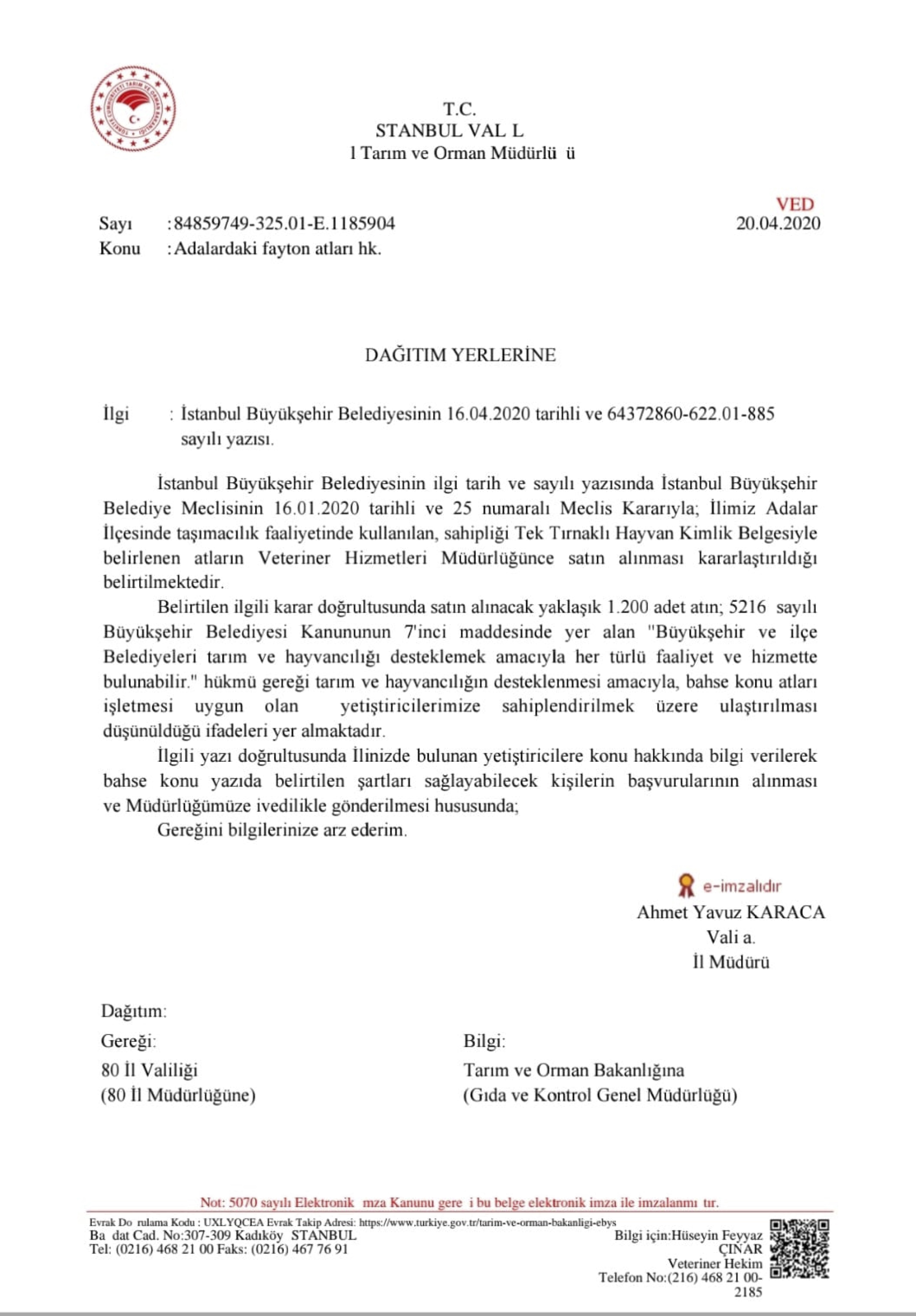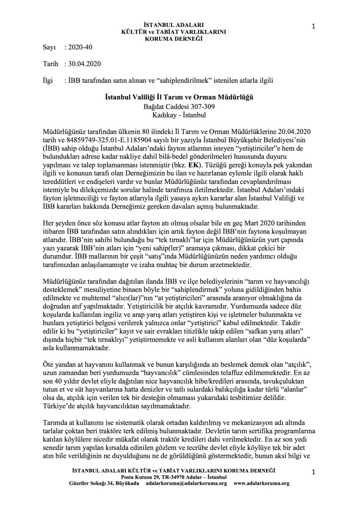 İBB Başkanlığı’na ait bu yazı, Derneğimizin at ve atçılık konusunda yetkili üyesi Emin Mahir Başdoğan’ın kaleme aldığı 30.04.2020 tarihli dilekçeye asla cevap olamayacak niteliktedir ve İBB gibi çok önemli bir kuruma ait bir sorumsuzluk örneğidir. Emin Mahir Başdoğan’ın dilekçenin özellikle giriş bölümündeki açıklamaları İBB’ye yöneltilen sorular açısından önemlidir. Bu dilekçeyi ve İBB’nin yazısını kamuoyunun dikkatine sunuyoruz.