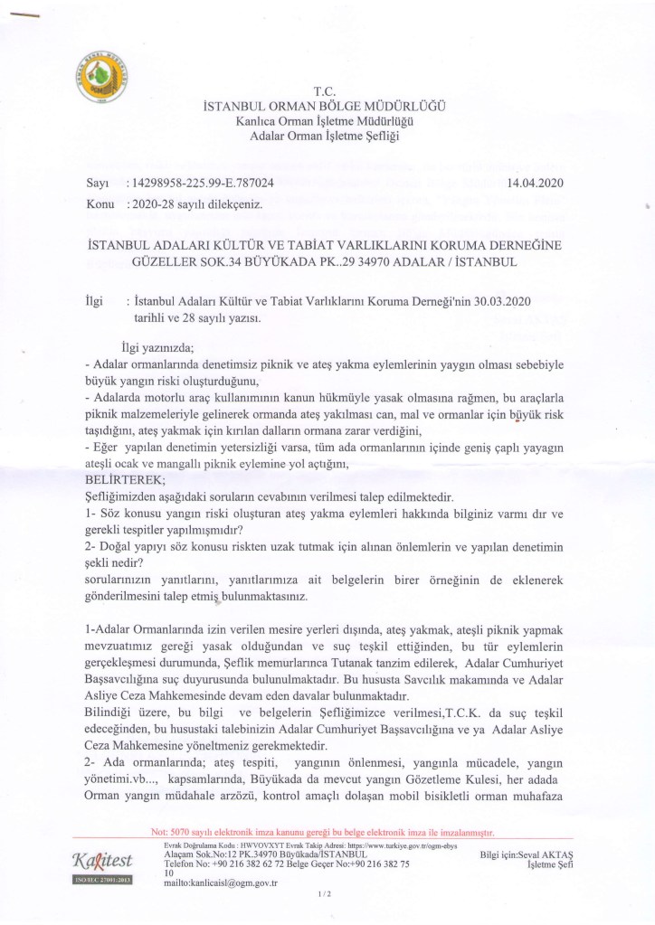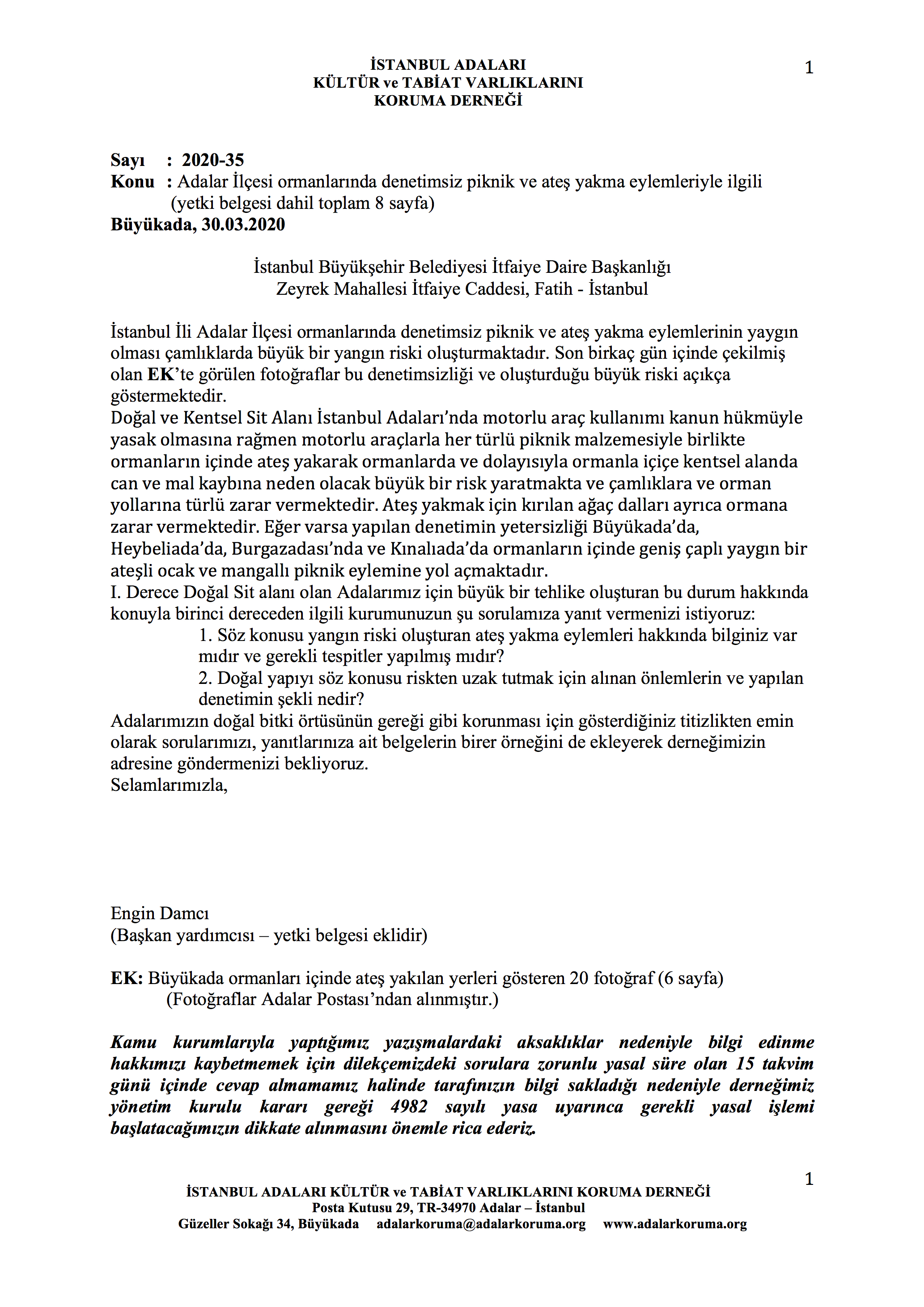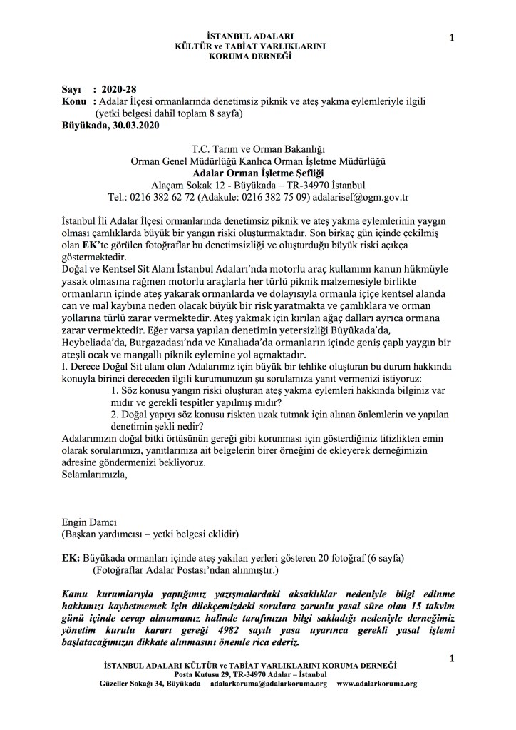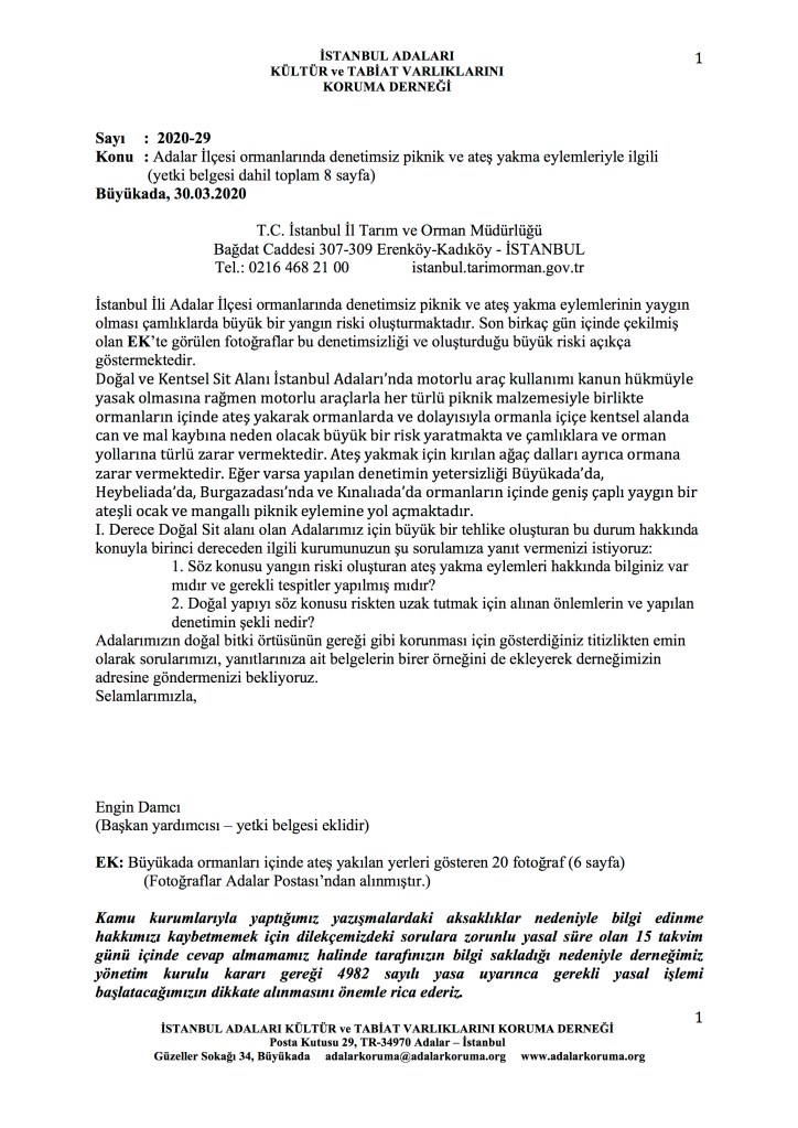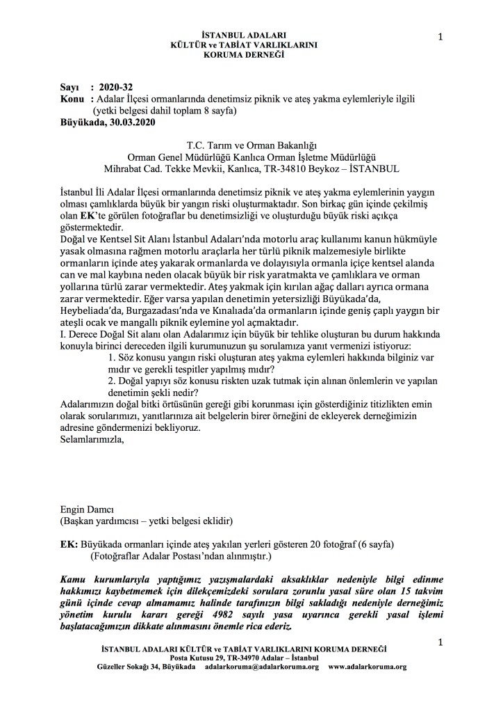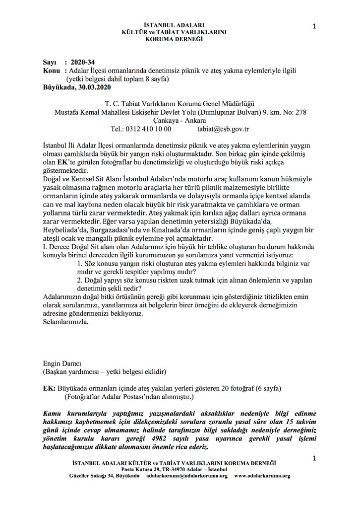 İstanbul Adaları Kültür ve Tabiat Varlıklarını Koruma Derneği’nin (İAKTVKD) 30.3.2020 tarihli “Adalar İlçesi ormanlarında denetimsiz piknik ve ateş yakma eylemleri” konulu resmî başvuruları ile gelen gelmeyen yanıtları…