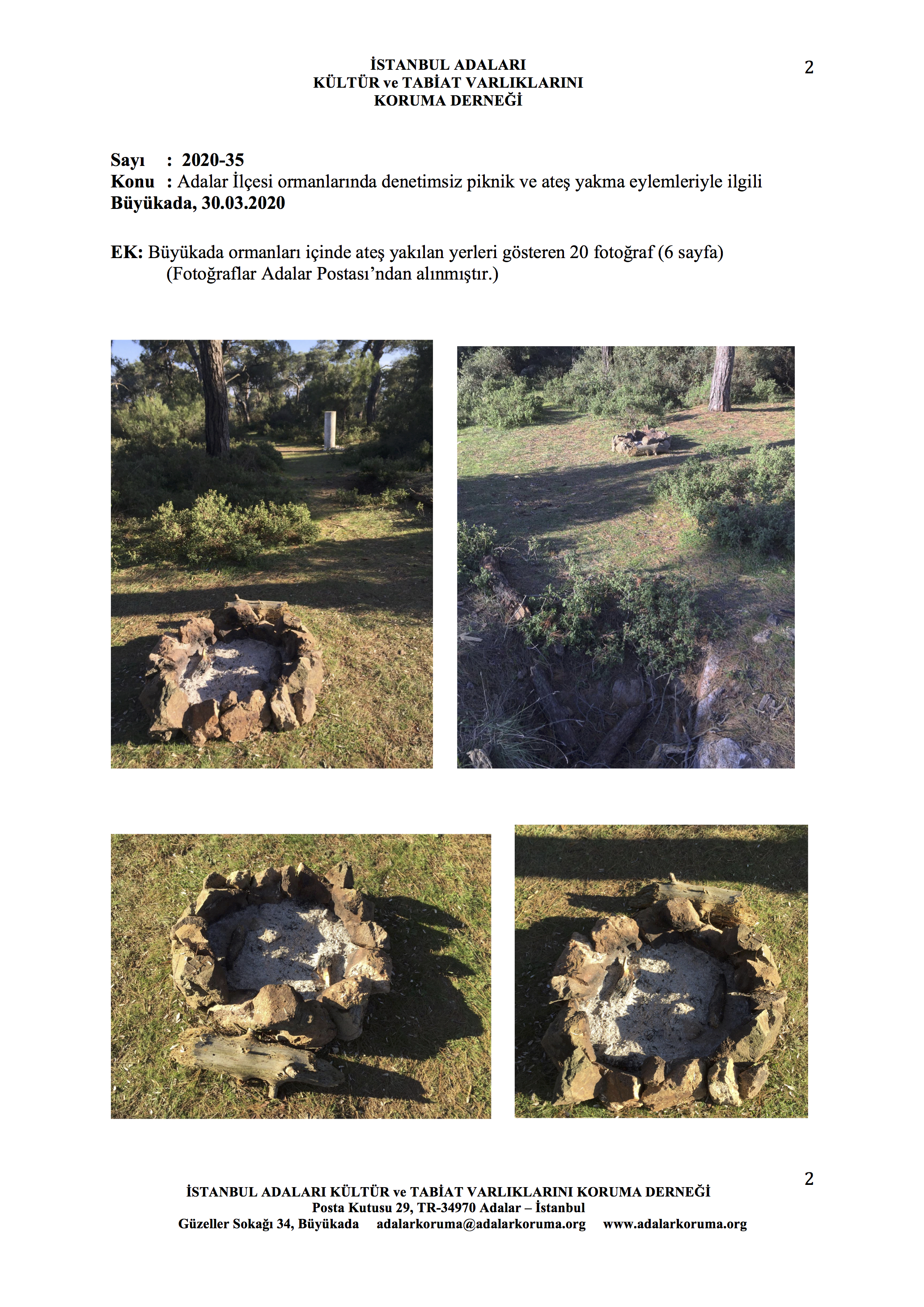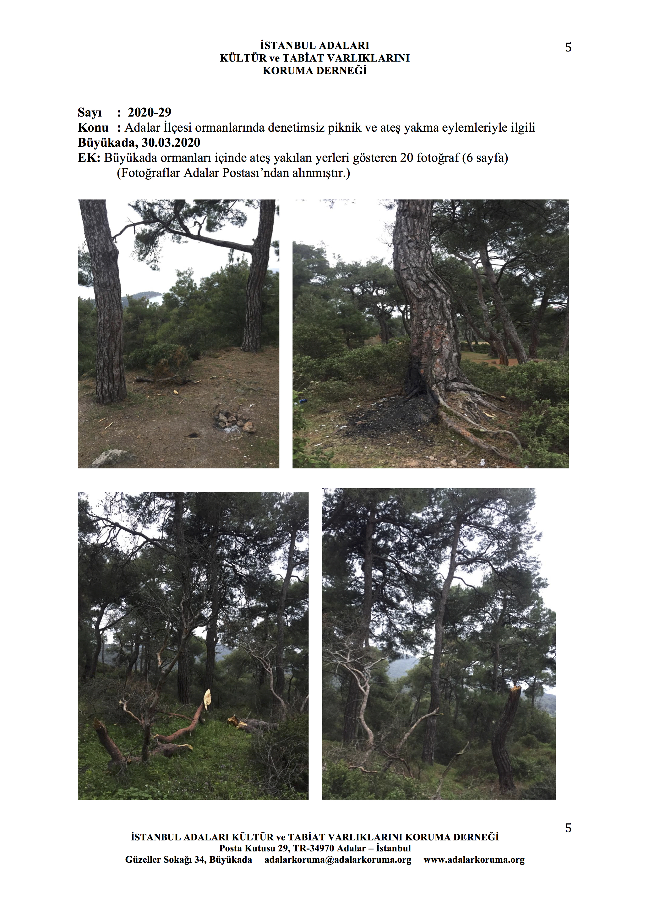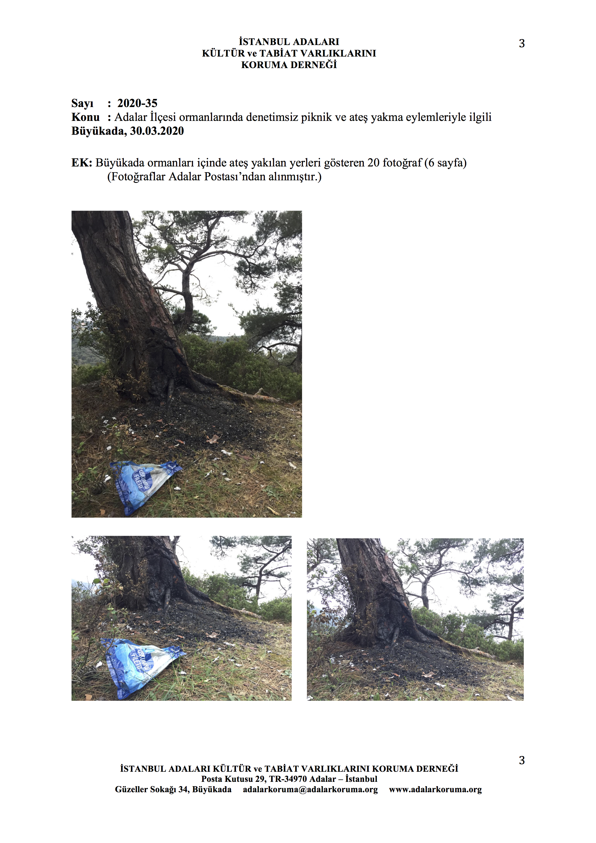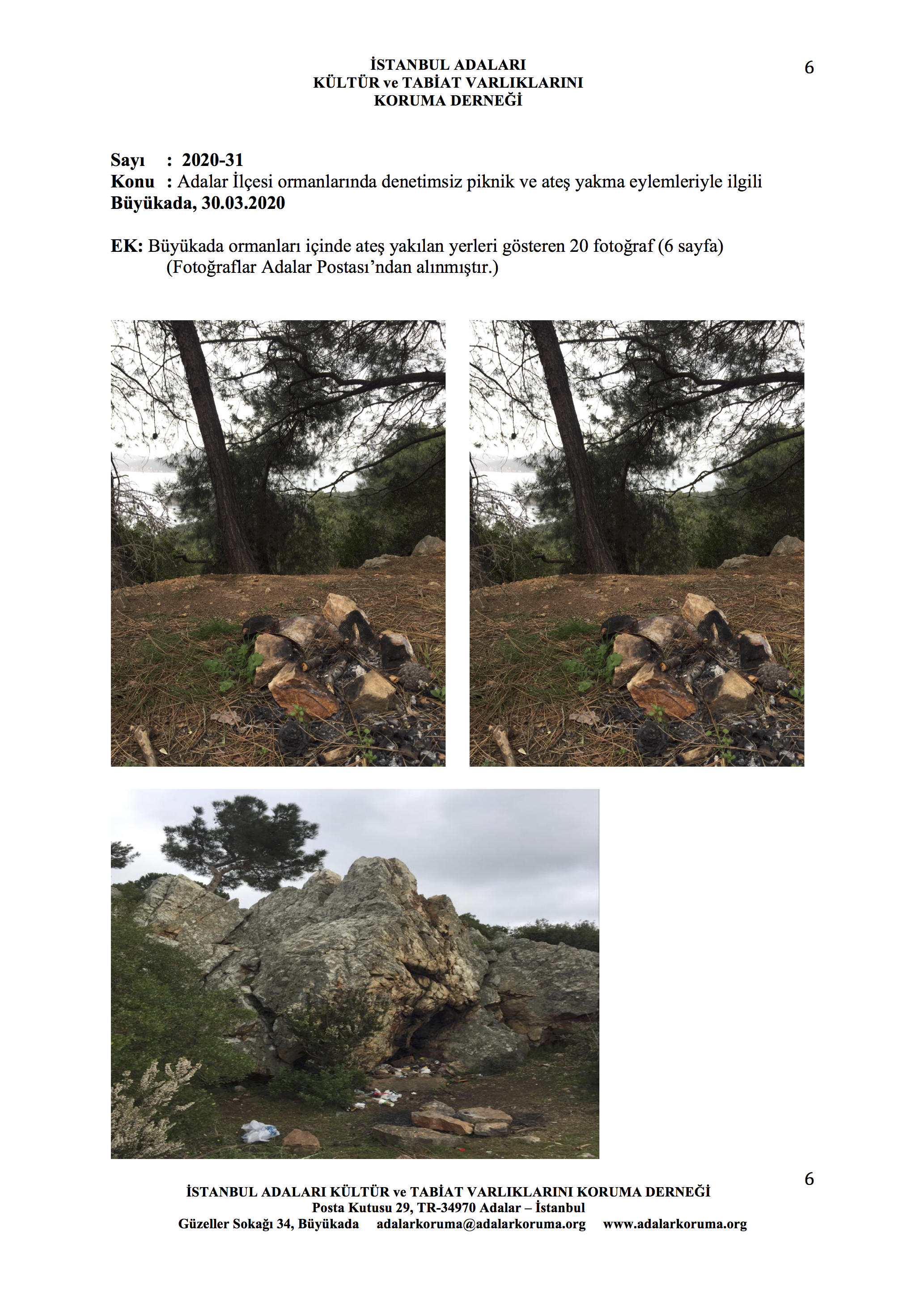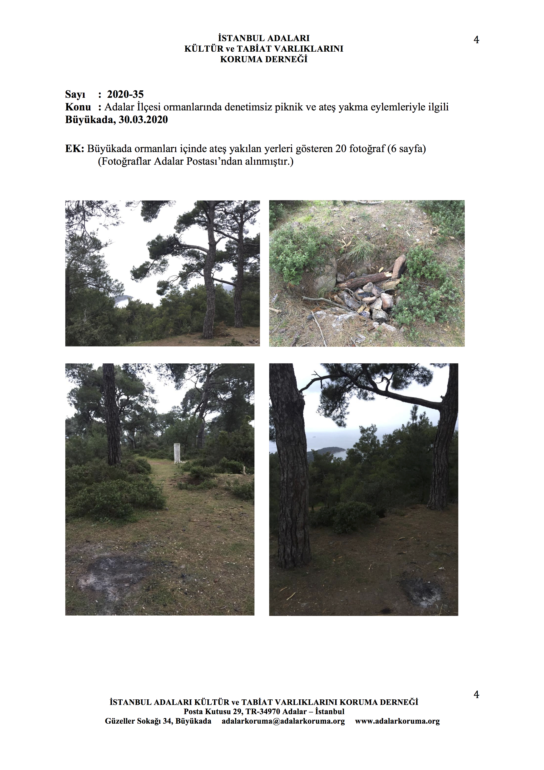 Bundan bir süre önce [25 Mart 2020] yasak olmasına rağmen ada ormanlarında yakılan ateş izleri ve ocaklarının çekilen fotoğrafları Adalar Postası tarafından Derneğimize ulaştırılır ulaştırılmaz, ormanların korunmasıyla ilgili tüm kurumlara, Adalar Orman İşletme Şefliği’nden ilgili Bakanlığın genel müdürlüklerine kadar ne kadar sorumlu kurum varsa pek yakında yangın çıkacağının apaçık işareti olan ateş izi ve ocaklarının fotoğraflarıyla birlikte yapılması gereken denetimi soran uyarı yazıları göndermiştik: “Adalar İlçesi ormanlarında denetimsiz piknik ve ateş yakma eylemlerinin yaygın olması çamlıklarda büyük bir yangın riski oluşturmaktadır. Son birkaç gün içinde çekilmiş olan EK’te görülen fotoğraflar bu denetimsizliği ve oluşturduğu büyük riski açıkça göstermektedir.” Başvurulara cevap dahi vermeme sorumsuzluğu gösteren kurumları da Bilgi Edinme ve Değerlendirme Kurulu’na şikâyet etmiştik.