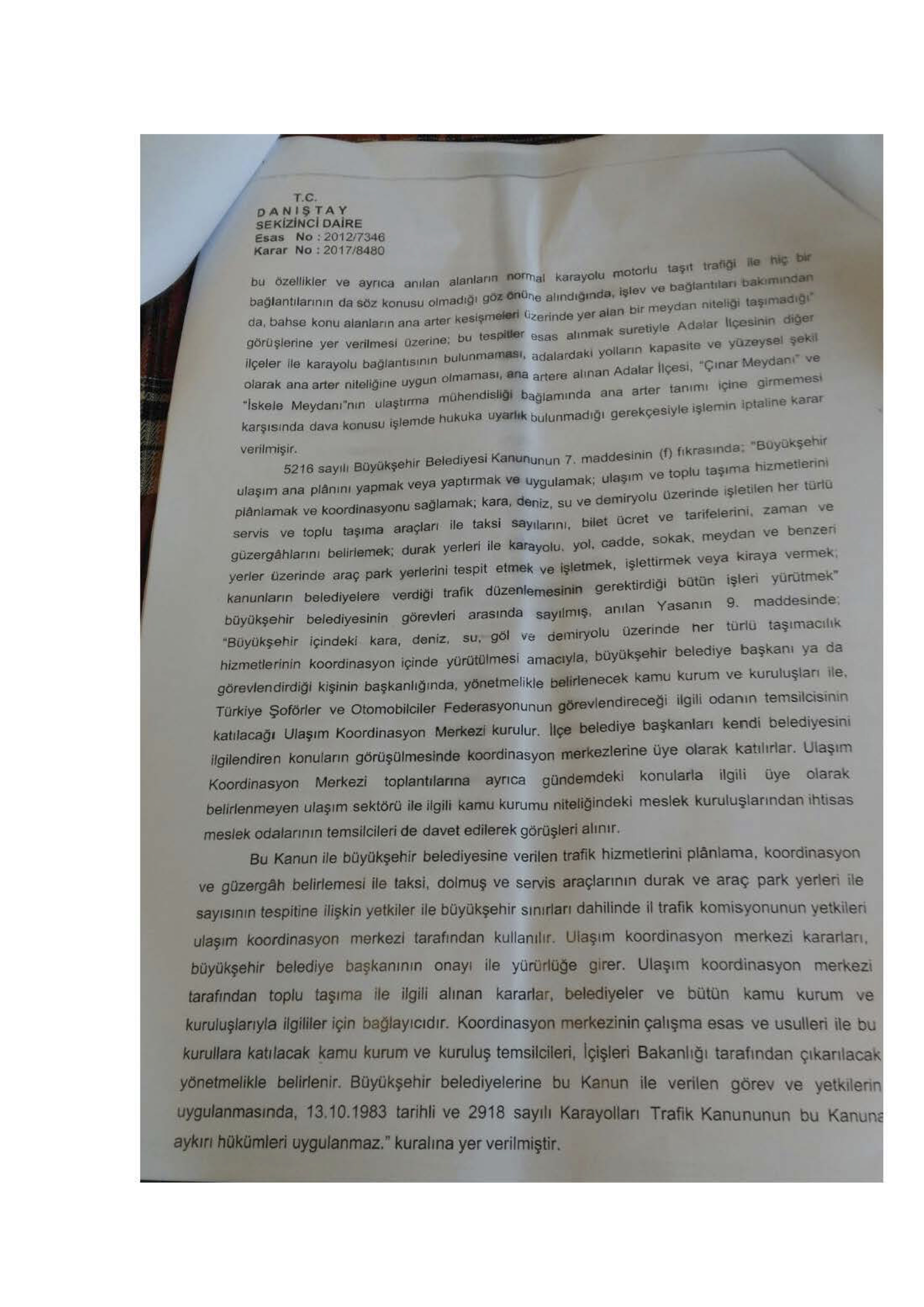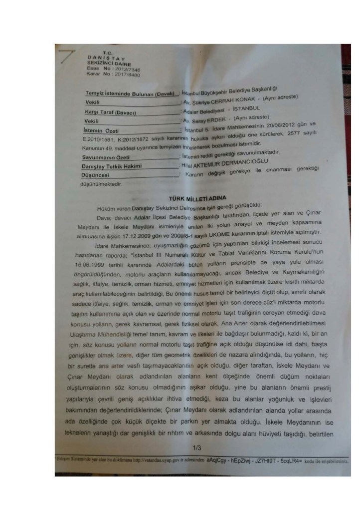 “Adalar İlçesi’nin diğer ilçeler ile karayolu bağlantısının bulunmaması, adalardaki yolların kapasite ve yüzeysel şekil olarak ana arter niteliğine uygun olmaması, ana artere alınan Adalar İlçesi, “Çınar Meydanı” ve “İskele Meydanı”nın ulaştırma mühendisliği bağlamında ana arter tanımı içine girmemesi” gereğiyle İBB’nin Adalar’da ilan etmeye çalıştığı ana arter (anayol) işlemlerinin iptaline karar veren idare mahkemesi kararını Danıştay onamıştır. (bkz. Ek: 1)