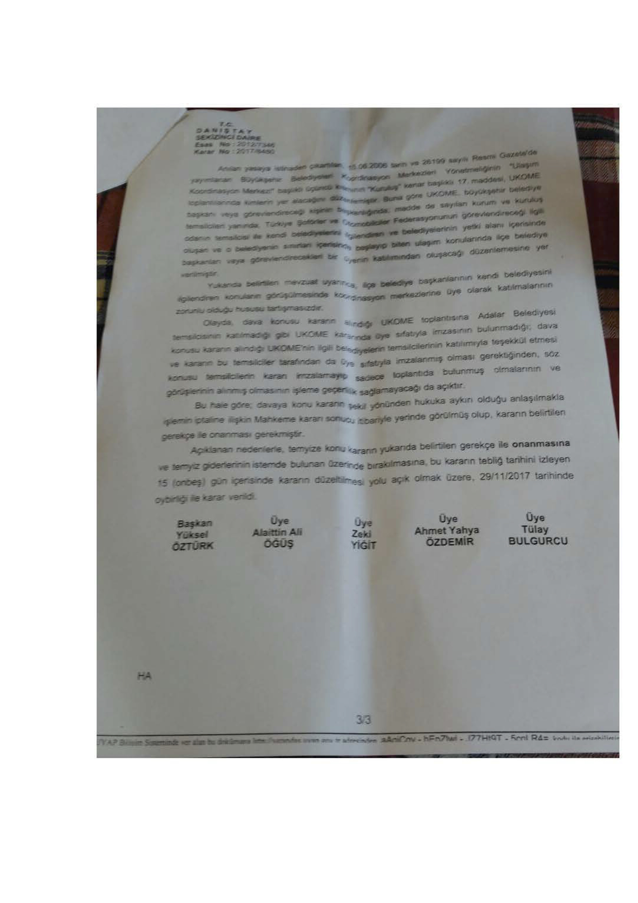 Danıştay kararının birinci bölümü Adalar’a “anaarter” olamayacağıyla ilgili. İkinci bölümü ise UKOME kararlarının alınmasında muhakkak karara konu ilçe belediyesi başkanı ya da temsilcisinin de bulunması ve kararı imzalamış olması gereğiyle ilgili. AKP’li UKOME Adalar Belediyesi’ni karara katmadığı için “anaarter” davasını kaybetmişti. Adalar’ın CHP’li misafir belediye başkanı, CHP’li UKOME’nin aldığı bu yeni karara misafir olarak katılmış mıdır? Karardaki imzalar arasında “üye Adalar belediyesi Tem.” yazıyor, karar taslağında isim yok. Adalar Belediyesi idare mahkemesi ve Danıştay kararına aykırı olarak Adalar ulaşımına el atan UKOME kararlarına ve UKOME’nin “anaarter” ilanlarına katılmakla hem yasaya aykırı hareket ediyor hem de kendi ilçe belediyesinin ulaşımını haksız ve yanlış olarak büyükşehir belediyesine bırakıyor. Ama zaten misafirin bu toplantıya ve karara katılması ya da katılmaması Adalar’da işlenen “anaarter” suçunu ortadan kaldıracak nitelikte değil.