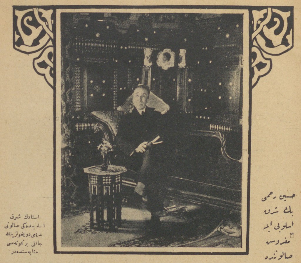 Bir yaz Ada’da üstada komşuluk ettiğimiz zaman bir akşam bizim romancı Reşat Nuri Bey, Reşat Nuri Bey’in refikası ve bendenizin refikamla üstadı ziyarete gitmiştik. Kütüphanesinde pek çok kıymetli kitaplar, duvarlarında bizzat Hüseyin Rahmi Bey tarafından yapılmış tablolar, köşelerinde üstadın eseri yastıklar, işlemeler bulunan odada Hüseyin Rahmi Bey misafirlerini izaz için bir aralık piyano da çaldılar. Gençlik senelerinden hatırlarında kalan polka ve mazorkaların tatlı terennümleri arasında geçirdiğimiz o geceyi hiç unutamam… Efendim, böyle hem romancı, hem ressam, hem musikişinas bir sanatkâr nerede bulabilirsiniz?