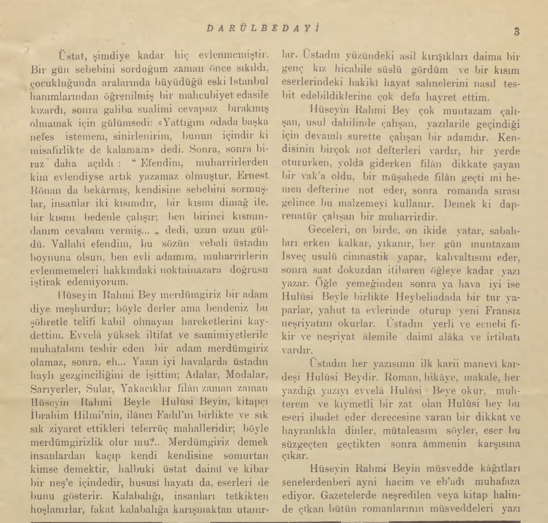 Üstat, şimdiye kadar hiç evlenmemiştir. Bir gün sebebini sorduğum zaman önce sıkıldı, çocukluğunda aralarında büyüdüğü eski İstanbul hanımlarından öğrenilmiş bir mahcubiyet edasile kızardı, sonra galiba sualimi cevapsız bırakmış olmamak için gülümsedi: «Yattığım odada başka nefes istemem, sinirlenirim, bunun içindir ki misafirlikte de kalamam» dedi. Sonra, sonra biraz daha açıldı: “Efendim, muharrirlerden kim evlendiyse artık yazamaz olmuştur, Ernest Rönan da bekârmış, kendisine sebebini sormuşlar, insanlar iki kısımdır, bir kısmı dimağ ile, bir kısmı bedenle çalışır; ben birinci kısmındanım cevabını vermiş…” dedi, uzun uzun güldü. Vallahi efendim, bu sözün vebali üstâdın boynuna olsun, ben evli adamım, muharrirlerin evlenmemeleri hakkındaki nokta-i nazara doğrusu iştirak edemiyorum.
