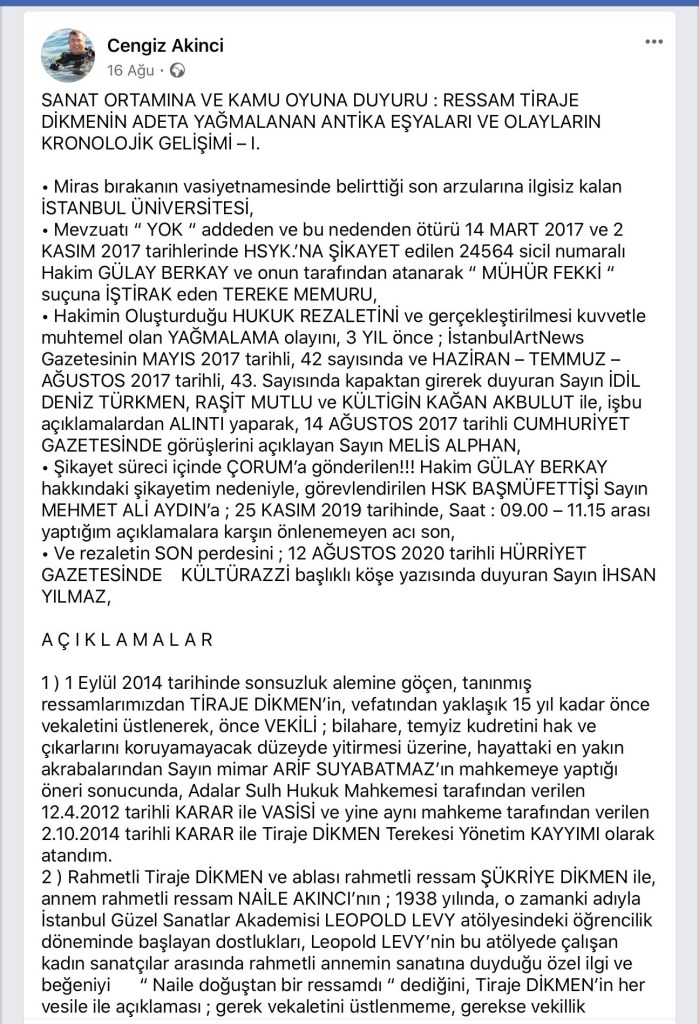 İstanbul Adaları Kültür ve Tabiat Varlıklarını Koruma Derneği’mizin (İAKTVKD) 17.07.2020 tarihinde beş değişik makama yaptığı suç duyurusundan ve bu duyurunun Adalar Postası’nda yayımlanmasından [bkz. Arif Çağlar, “Tiraje Dikmen’in Adıyla ve Mirasıyla Oynanan Oyunlar”, Adalar Postası-2998 (10.8.2020).] sonra Cengiz Akıncı’nın 16, 17 ve 18 Ağustos 2020 tarihlerinde kendisine ait facebook hesabı üzerinden “Sanat Ortamına ve Kamu Oyuna Duyuru” başlığı altında yazdıkları [bkz. Ek-1: Cengiz Akıncı, “Sanat Ortamına ve Kamu Oyuna Duyuru: Ressam Tiraje Dikmen’in Adeta Yağmalanan Antika Eşyaları ve Olayların Kronolojik Gelişimi-I, Facebook, 16.8.2020-22:48.; Ek-2: Cengiz Akıncı, “Rezalet Zincirinin Halkaları-II, Facebook, 17.8.2020-17:40.; Ek-3: Cengiz Akıncı, “Hukuk Rezaletinin Son Perdesi-III”, Facebook, 18.8.2020-07:41.] Tiraje Dikmen terekesiyle oynan oyunların tahmin edilenin ötesinde bir vahamette olduğunu göstermiştir.