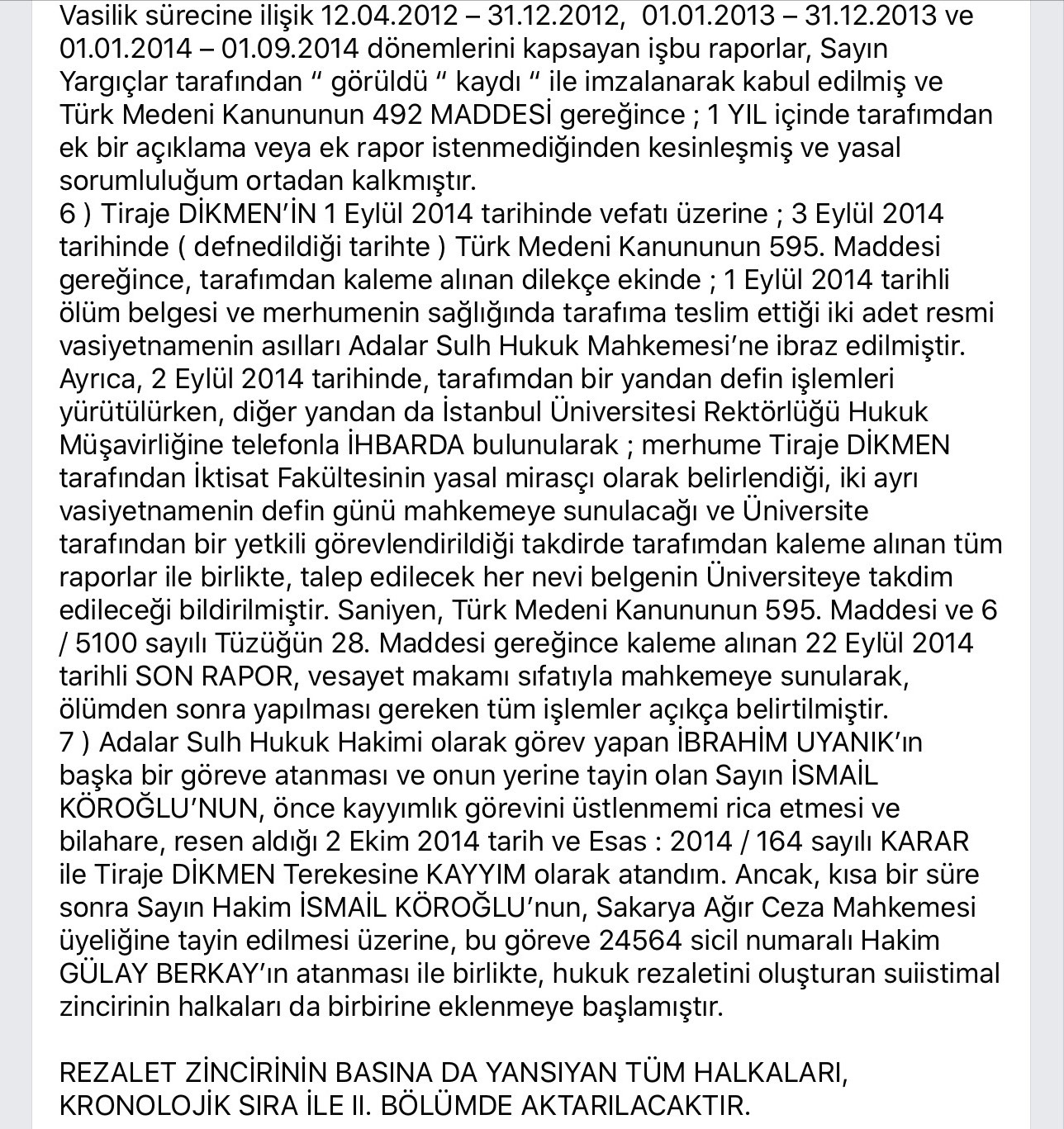 B ) Ve bu olaylarla bağlantılı olarak TİRAJE DİKMEN TEREKESİ KAYYIMLIĞINDAN 2 Aralık 2015 tarihinde ve Türk Medeni Kanununda belirtilen HAKLI NEDENLERLE İSTİFA etmeme karşın ; işbu HUKUK REZALETİ nedeniyle, sürekli olarak görüşlerimin sorulmasından ve yanıt vermekten ötürü çok sıkıldım.