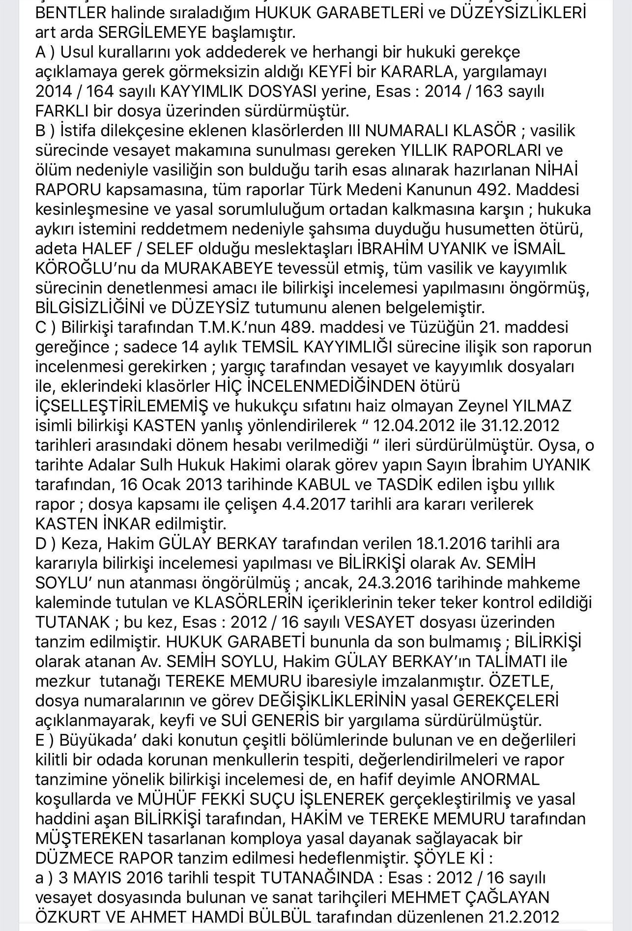 9 ) Bu süreç içinde romatizma ve siyatik nedeniyle oluşan sağlık sorunlarımın ağırlaşması ve doktorlar tarafından mutlak dinlenme önerilmesi üzerine, tarafımdan sağlık raporları da eklenmek suretiyle Büyükada Sulh Hukuk Mahkemesi’nin Esas : 2014 / 164 sayılı KAYYIMLIK dosyasına sunulan 2.12.2015 tarihli İSTİFA dilekçesi ile ; Türk Medeni Kanununun 417 / 1 – 2 maddelerinde belirtilen vasilikten kaçınma nedenlerinin gerçekleştiği ( 60 yaşını aşma, rahatsızlık ) ve 456 / 6 maddesinde belirtilen ( 4 yıl dolunca vasilikten kaçınma hakkı ) vurgulanarak kayyımlıktan istifa edilmiştir. Ayrıca, istifa dilekçesine eklenen, 5 AYRI KLASÖRÜN içerikleri ve kapsadıkları belgelerin mahiyetleri de ( BÜYÜKADA Bahçelerönü sokakta No : 4 adresindeki köşkte bulunan ve ŞİŞLİ’DEKİ apartman dairesinden getirtilen antikalar, objeler, tablolar, halılar, hatlar ve sair kıymetli eşyaların nelerden ibaret olduğunu FOTOĞRAFLI olarak belgeleyen ve ADALAR SULH HUKUK MAHKEMESİ tarafından VESAYET KARARI verilmeden önce gerçekleştirilen BİLİRKİŞİ İNCELEMESİ sonucunda SANAT TARİHÇİSİ – BİLİRKİŞİLER MEHMET ÇAĞLAYAN ÖZKURT ve AHMET HAMDİ BÜLBÜL tarafından kaleme alınan 21 ŞUBAT 2012 tarihli BİLİRKİŞİ RAPORU, vasilik ve kayyımlık süreçlerinde saklanan tüm resmi belgeler, yıllık raporlar, mal varlığı defteri ve kıymetli tablo ve antikaların muhafaza edildiği odanın ANAHTARI ) açıklanmış ve istifa nedeniyle vasiliğin sona erdiği tarih esas alınarak hazırladığım NİHAİ RAPOR da istifa dilekçesine eklenmiştir.
