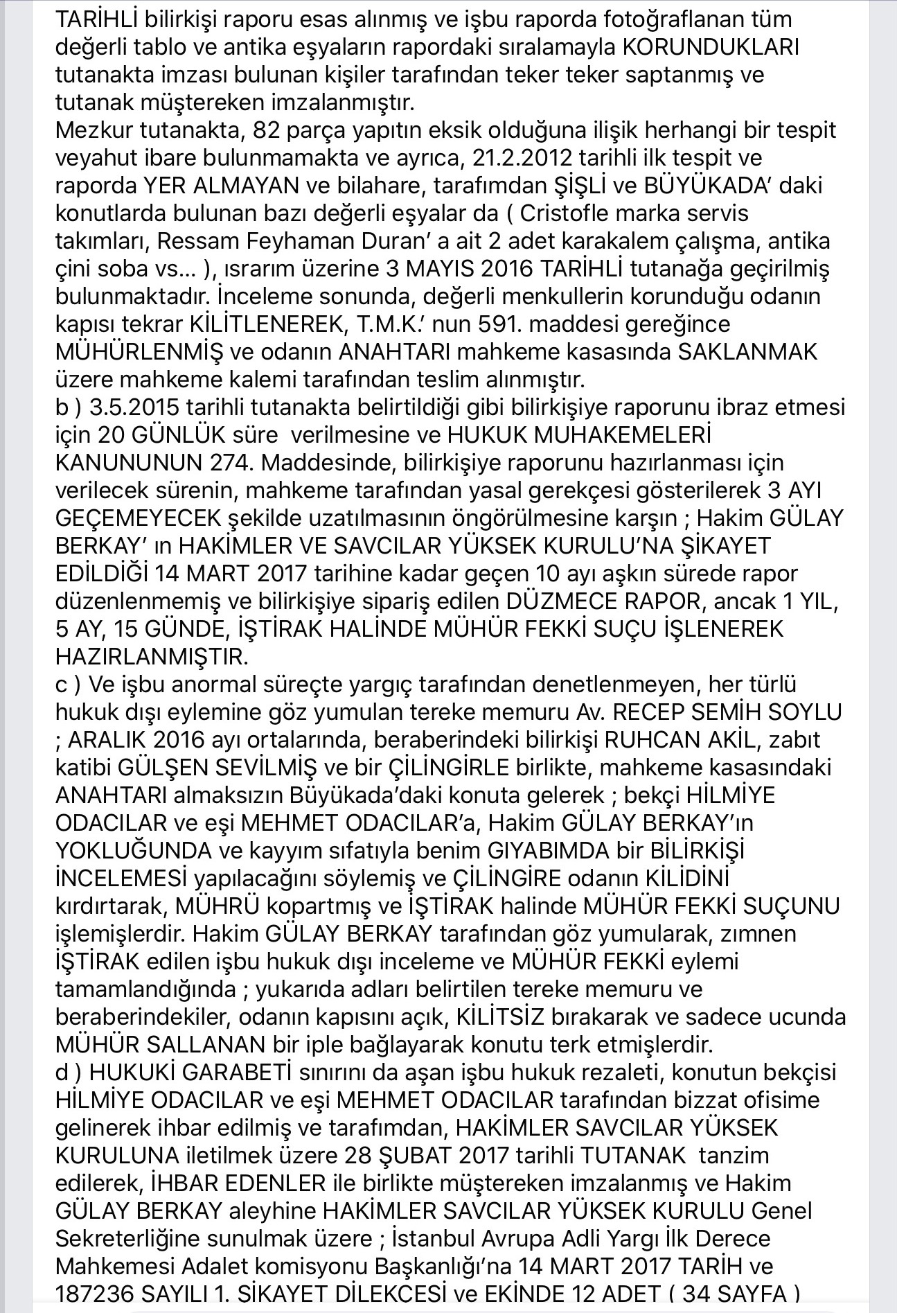 d ) HUKUKİ GARABETİ sınırını da aşan işbu hukuk rezaleti, konutun bekçisi HİLMİYE ODACILAR ve eşi MEHMET ODACILAR tarafından bizzat ofisime gelinerek ihbar edilmiş ve tarafımdan, HAKİMLER SAVCILAR YÜKSEK KURULUNA iletilmek üzere 28 ŞUBAT 2017 tarihli TUTANAK tanzim edilerek, İHBAR EDENLER ile birlikte müştereken imzalanmış ve Hakim GÜLAY BERKAY aleyhine HAKİMLER SAVCILAR YÜKSEK KURULU Genel Sekreterliğine sunulmak üzere ; İstanbul Avrupa Adli Yargı İlk Derece Mahkemesi Adalet komisyonu Başkanlığı’na 14 MART 2017 TARİH ve 187236 SAYILI 1. ŞİKAYET DİLEKÇESİ ve EKİNDE 12 ADET ( 34 SAYFA ) YAZILI SUÇ DELİLLERİ VERİLMİŞTİR.