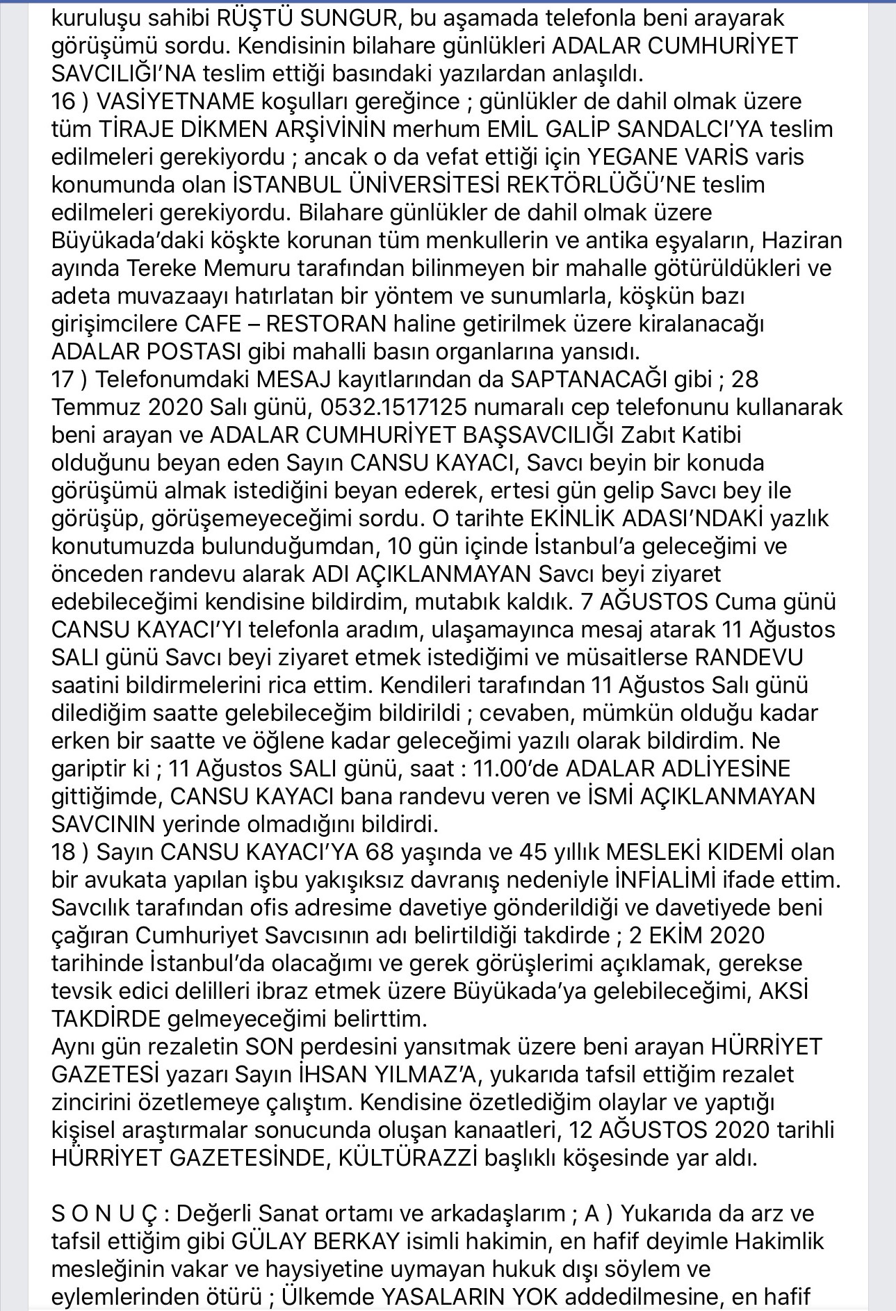 […] 15 ) Tahliyeyi müteakip TEMMUZ veya AĞUSTOS 2020 aylarında ARTİUM Müzayede Evi tarafından düzenlenen bir müzayede de “ TİRAJE DİKMEN’İN GÜNLÜKLERİNİN “ satışa sunulduğu anlaşılınca ; gerek sanat ortamında, gerekse Büyükada’da yaşayan entelektüeller arasında haklı bir infial oluştu. İşbu haklı infial başta HÜRRİYET GAZETESİ olmak üzere, ADALAR POSTASI gibi mahalli basın organlarına ve SOSYAL MEDYAYA yansıyınca ; gelişmelerden ürken, günlükleri satışa sunmadan önce görüşümü alması gerekirken, buna gerek görmeyen, kendisi de eski bir Akademili olduğu için rahmetli Tiraje DİKMEN ile olan hukuki ve insani bağlarımı bilen müzayede kuruluşu sahibi RÜŞTÜ SUNGUR, bu aşamada telefonla beni arayarak görüşümü sordu. Kendisinin bilahare günlükleri ADALAR CUMHURİYET SAVCILIĞI’NA teslim ettiği basındaki yazılardan anlaşıldı. […]