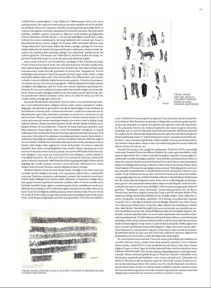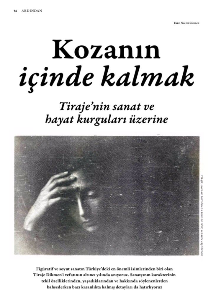 2010’dan itibaren Tiraje’nin koza olarak üstüne titrediği evinin onun sanatı için ne kadar önemli olduğunu kavrayıp, evin yapısından, bahçesinden, oranlarından yola çıkıp Tiraje’nin resimlerine yakınlaşmaya çalıştım. Bu metaforik olarak misafirlerin kabul edildiği birinci kattan, yatak odalarının ve banyoların olduğu ikinci kata geçip, kozanın çeperlerini tanımama yardımcı oldu. O zaman içimden iyi ki bu kitabı içimdeki isteğe rağmen yayımlamamışım deyip, yazdıklarımı yeniden şekillendirmeye başladım. 2011 sonlarında sağlık sorunlarıyla mücadele etmeye başlayan Tiraje’yle istediğimiz şekilde çalışmaya devam edemiyorduk. Onu son olarak 25 Aralık 2012’de avukatı Cengiz Akıncı ile Bostancı’da kaldığı huzurevinde ziyaret ettim. Artık kitaptan değil başka şeylerden konuşuyorduk. Yorucu bir mücadeleden sonra 1 Eylül 2014’te yaşama gözlerini kapatan Tiraje kozasının içinde kalarak belki de Modern Türk Resmi’nin en gizemli, el değmedik yorumlarını geliştirip kelimenin tam anlamıyla sıra dışı bir tarz geliştirerek özgün bir resim dili oluşturmuştu. Bu çalışmalar Paris’te iki, Ankara-İstanbul’da altı kişisel sergiyle izleyicilere sunulduğu için ne yazık ki kapsamlı olarak bilinmemektedir. Hakkında kapsamlı bir serginin henüz düzenlenilmediği birkaç küçük çaplı yayın dışında kataloğunun hazırlanılmadığı Tiraje’yi “büyük bilinmeyen ressam” olarak tanımlamak herhalde yanlış olmaz. Sanat ortamının gündemine talihsiz şekilde Arap saçına dönmüş mirası, son olarak da müzayedelere düşen evrak-ı metrukiyesiyle gelen bu sanatçı hakkında elbette söylenecek çok şey var.