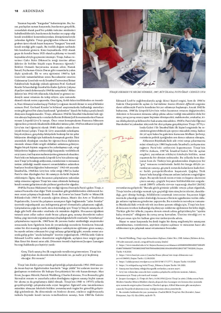 Sanat tarihi doktorası için İstanbul’dan ayrıldığım 1989 sonbaharına kadar Tiraje’yi birçok kere ziyaret ettim. Her seferinde büyük dosyalar içinden teker teker çıkararak gösterdiği çalışmaları beni büyülemişti. Zamanla resimleri kadar konuşmasında, yaşam tarzında, giyiminde ön plana çıkan “kurgularının” da beni etkilediğini duyumsadım. Hayat karşısında bu denli özgür, sadece kendi istediği biçimdeki olguları kabul eden, öbür alternatifleri hiç beklenmedik ama yaratıcı nedenler üreterek reddeden başka birisini tanımamıştım. O yüzden her görüşmemiz benim için ayrı bir heyecan kaynağıydı. 1989’da hakkında bir kitap yazmak istediğimi söylediğimde, tipik bir Tiraje tavrı olarak, düşünmesi gerektiğini belirtmişti. Bir yıl sonra yazdığı bir kartpostalda bunu kabul ettiğini, ancak yazdıklarımı okuma koşulu olduğunu bildiriyordu. Bu koşulu severek kabul ettim, çünkü yazdıklarımı okurken üstünde notlar alıyor, en ufak bir detay için bile her cümleyi hallaç pamuğu gibi sallıyordu.