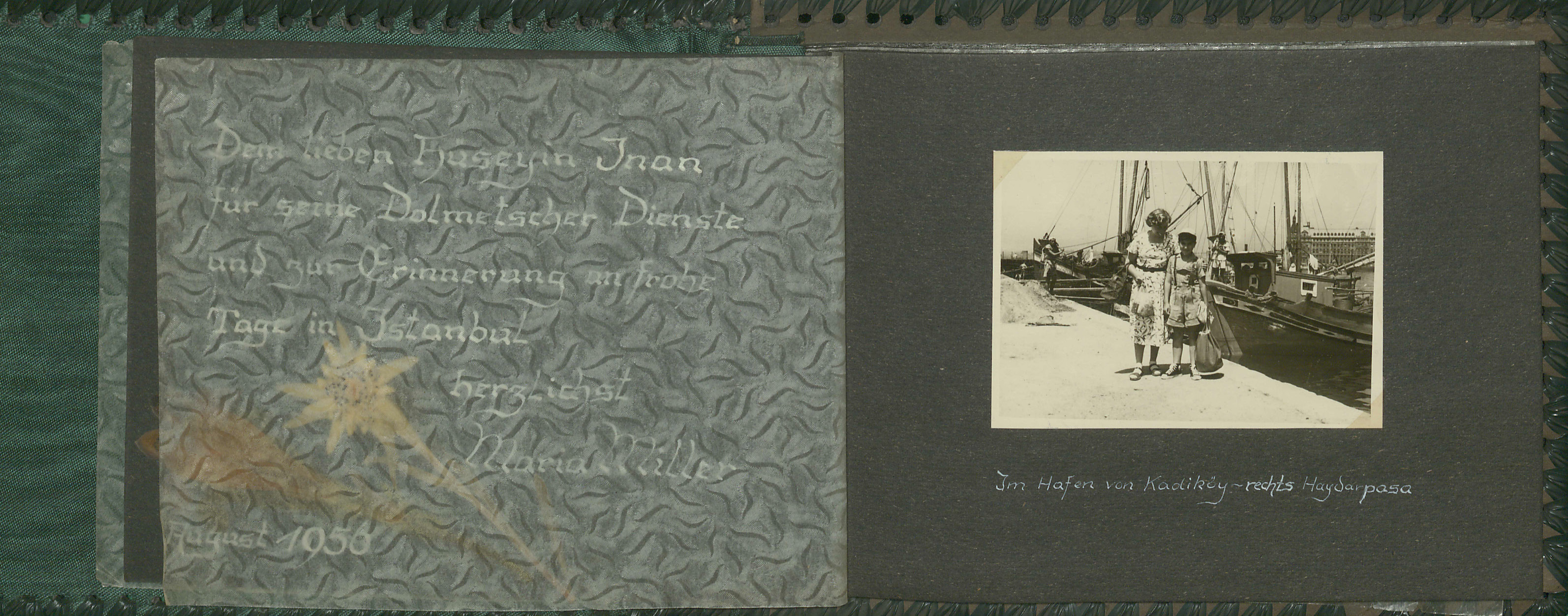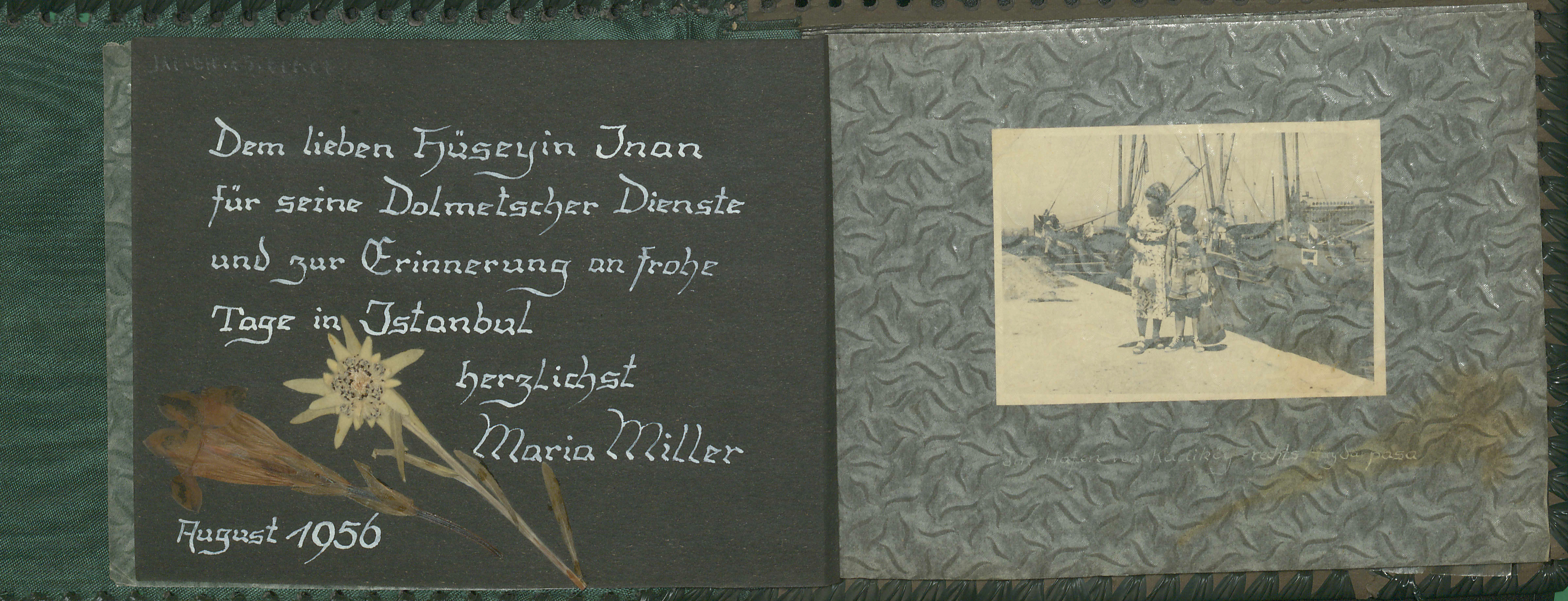 Maria Miller tarafından [München 13, Farinelli str. 23/0 Almanya] “Sevgili Hüseyin İnan’a* [Eşref Efendi Sokak No: 118/5 Pangaltı/İstanbul Türkiye] tercümanlık hizmetleri ve İstanbul’daki mutlu günlerin anısı için içtenlikle” ithafıyla gönderilen Ağustos 1956 tarihli fotoğraf albümünde, Maria Müller’in İstanbul’u ziyareti sırasında Jale İnan ile Mustafa İnan ve o vakit henüz on bir yaşındaki oğulları Hüseyin İnan’la İstanbul’un tarihi mekânlarında çekilmiş fotoğrafları yanı sıra kendisinin çizdiği bir İstanbul haritası da yer almaktadır.