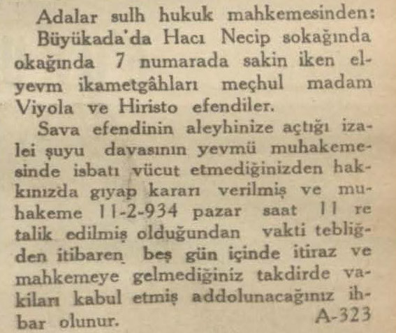 Sava Efendi’nin aleyhinize açtığı izalei şuyu davasının yevmü muhakemesinde isbatı vücut etmediğinizden hakkınızda gıyap kararı verilmiş ve muhakeme 11.2.1934 Pazar saat 11’e talik edilmiş olduğundan vakti tebliğden itibaren beş gün içinde itiraz ve mahkemeye gelmediğiniz takdirde vakiları kabul etmiş addolunacağınız ihbar olunur.
