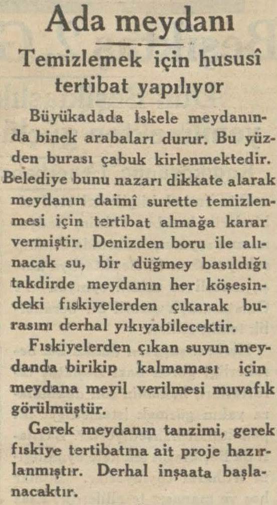 Büyükada’da İskele meydanında binek arabaları durur. Bu yüzden burası çabuk kirlenmektedir. Belediye bunu nazarı dikkate alarak meydanın daimî surette temizlenmesi için tertibat almaya karar vermiştir. Denizden boruyla alınacak su, bir düğmeye basıldığı takdirde meydanın her köşesindeki fıskiyelerden çıkarak burasını derhal yıkayabilecektir.