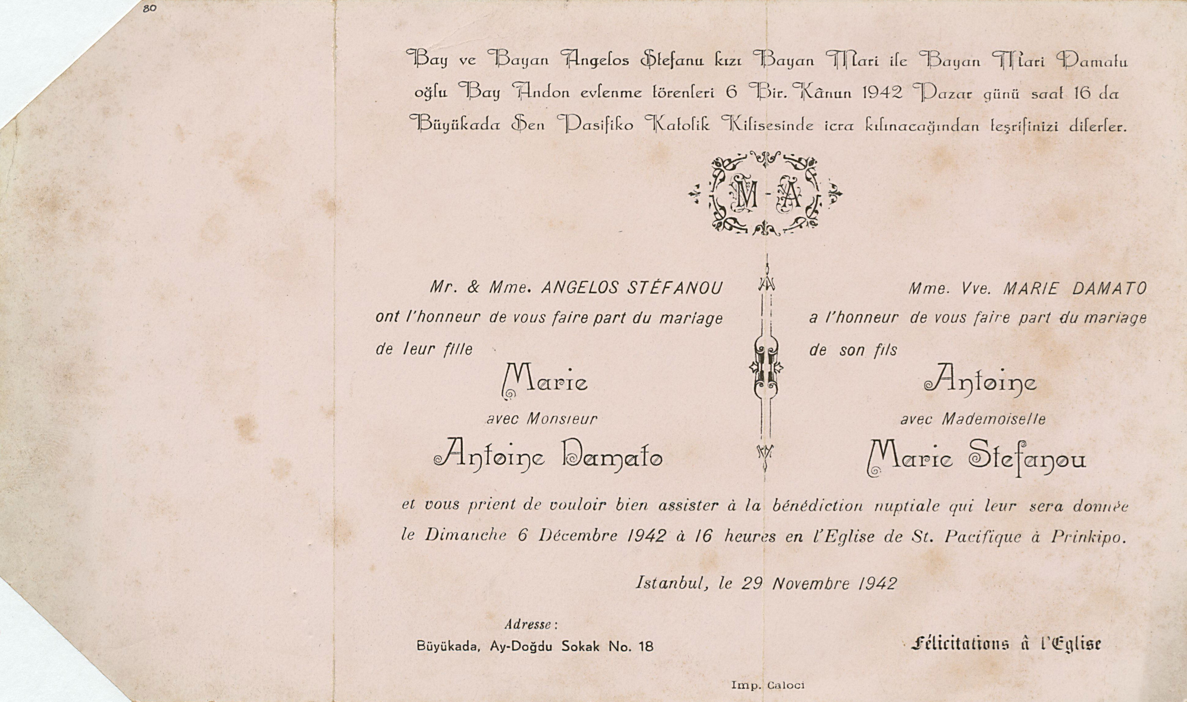 Bay ve Bayan Angelos Stefanu Bayan Mari ile Bayan Mari Damatu oğlu Bay Andon evlenme törenleri 6 Bir. Kânun 1942 Pazar günü saat 16’da Büyükada Sen Pasifiko Katolik Kilisesinde icra kılınacağından teşrifinizi dilerler.