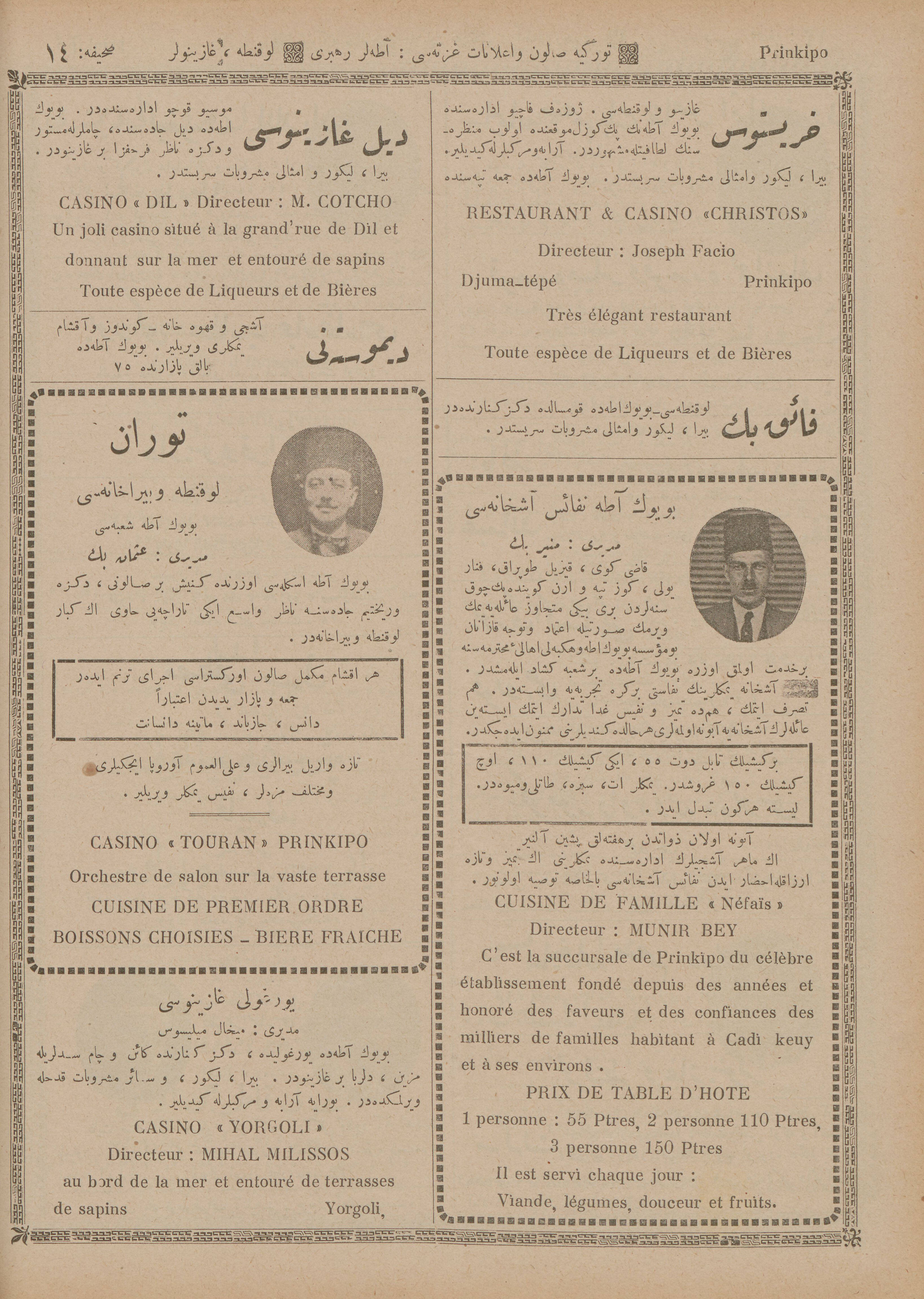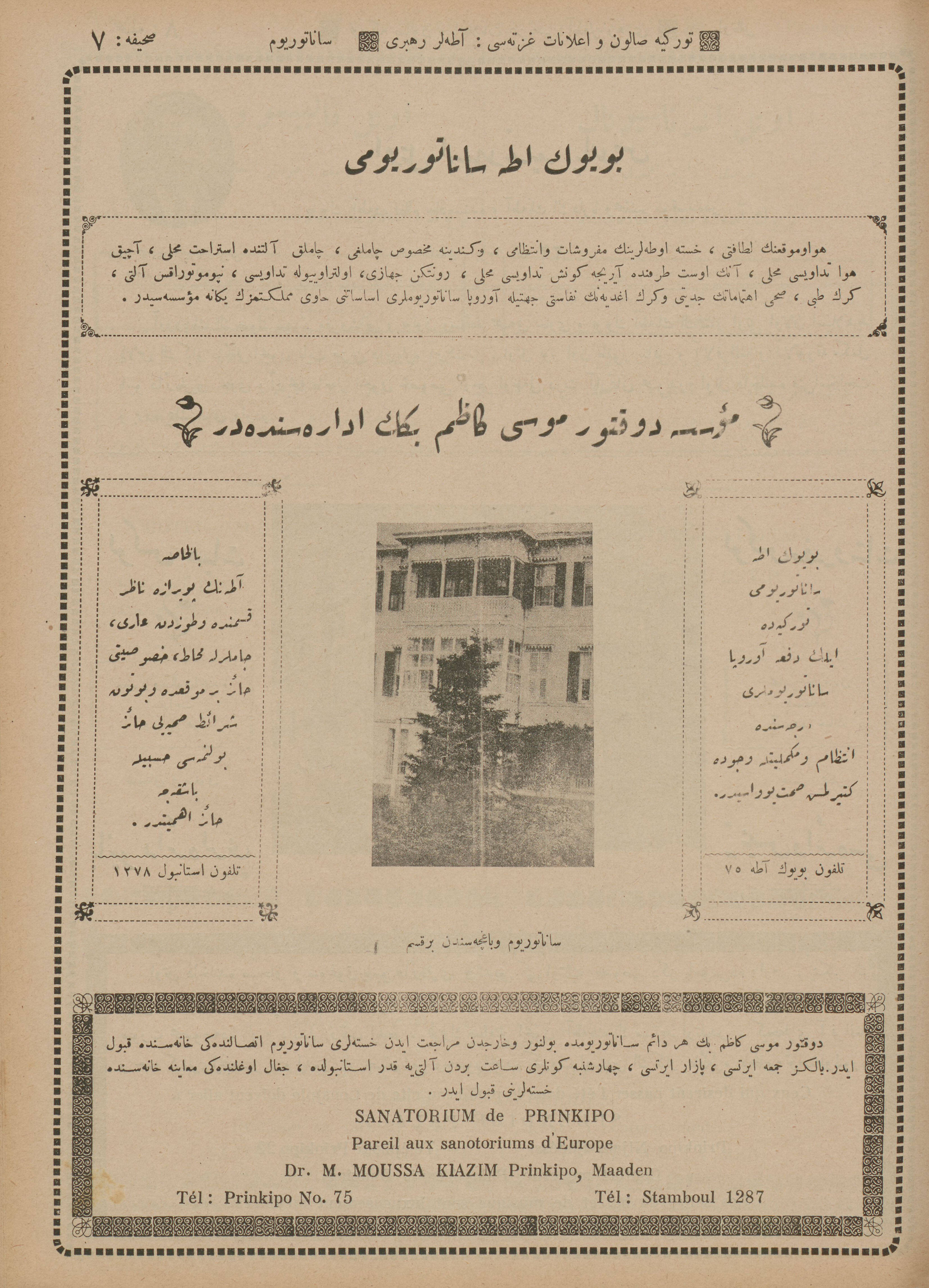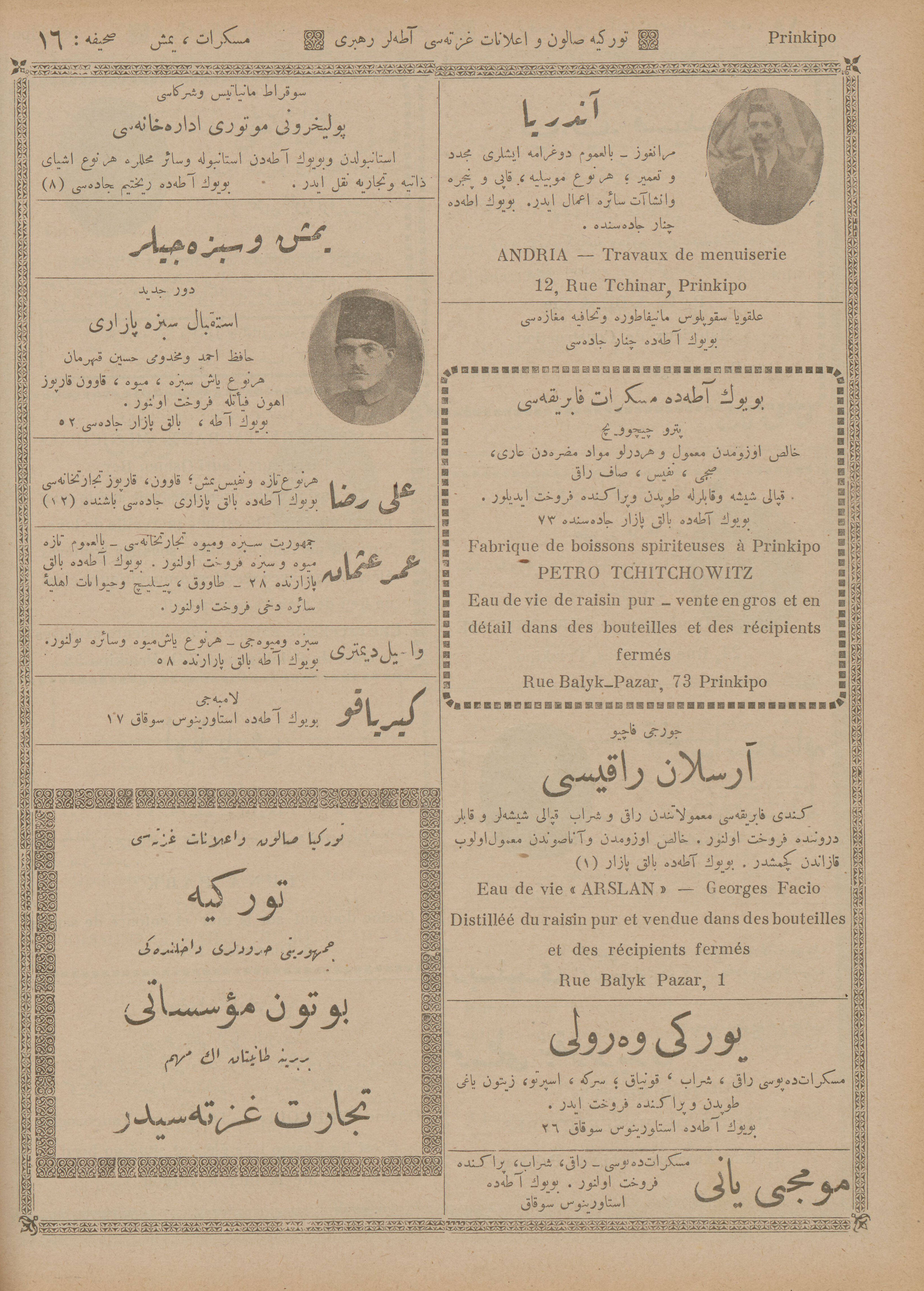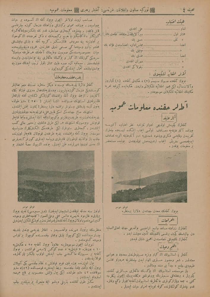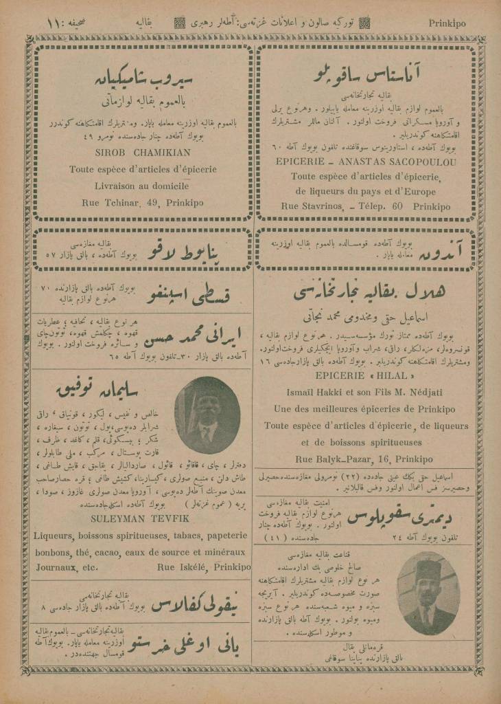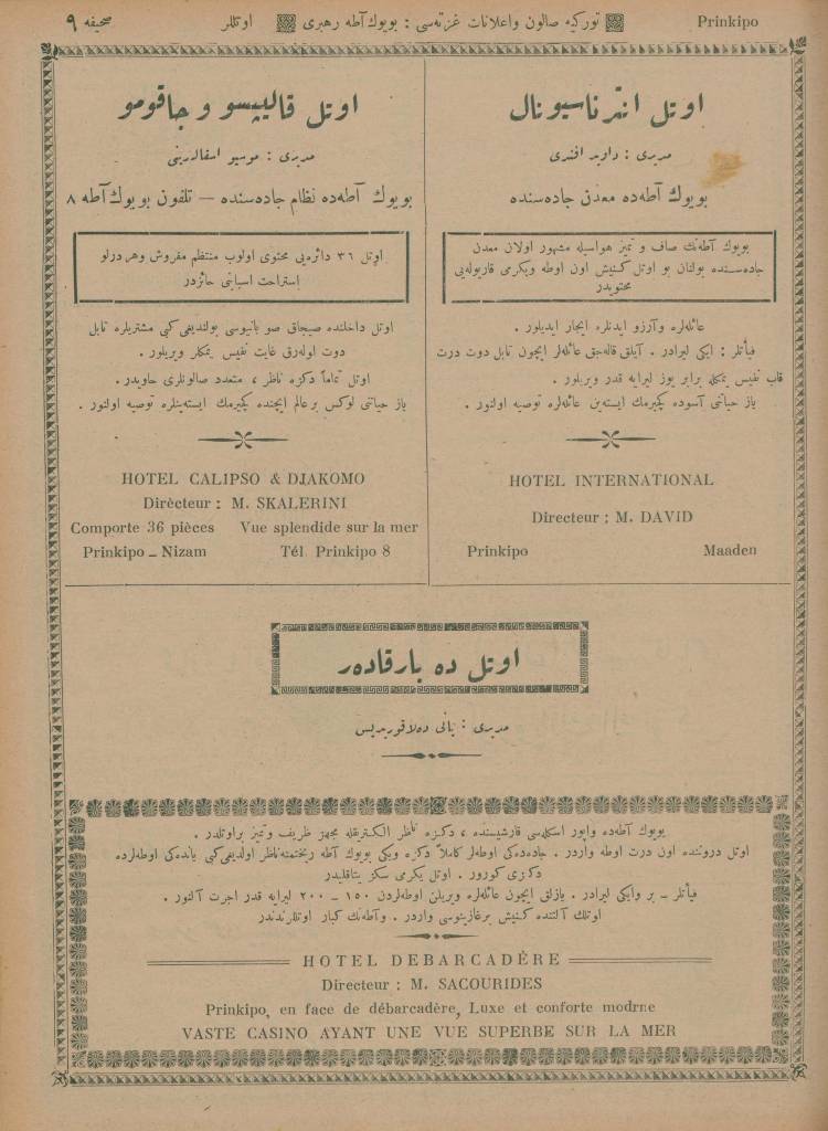 İstanbul’da ayda bir defa Türkçe ve Fransızca neşr olunan Türkiye Salon ve İlanat Gazetesi’nin 1925 (1341) senesinde Mahmud Bey Matbaası’nda basılan Ticaret Rehberi‘nin Adalar kısmında yer alan ticarî müesseselerin îlânlarını takdimle… Adalar Postası Tercüme Heyeti îlânların Osmanlıca ve Fransızca’dan tercümelerini tamamlar tamamlamaz da yayımlamak üzere…