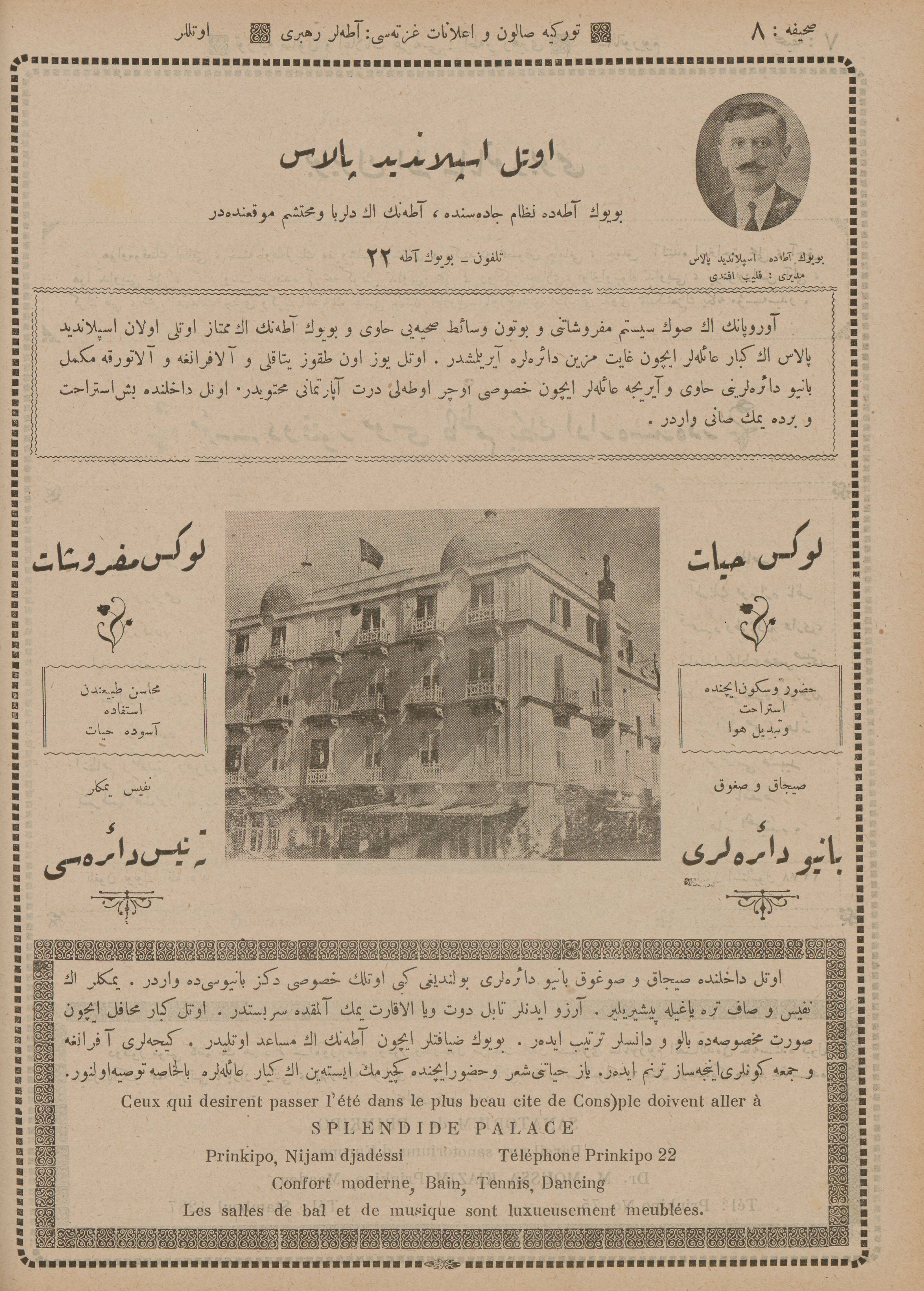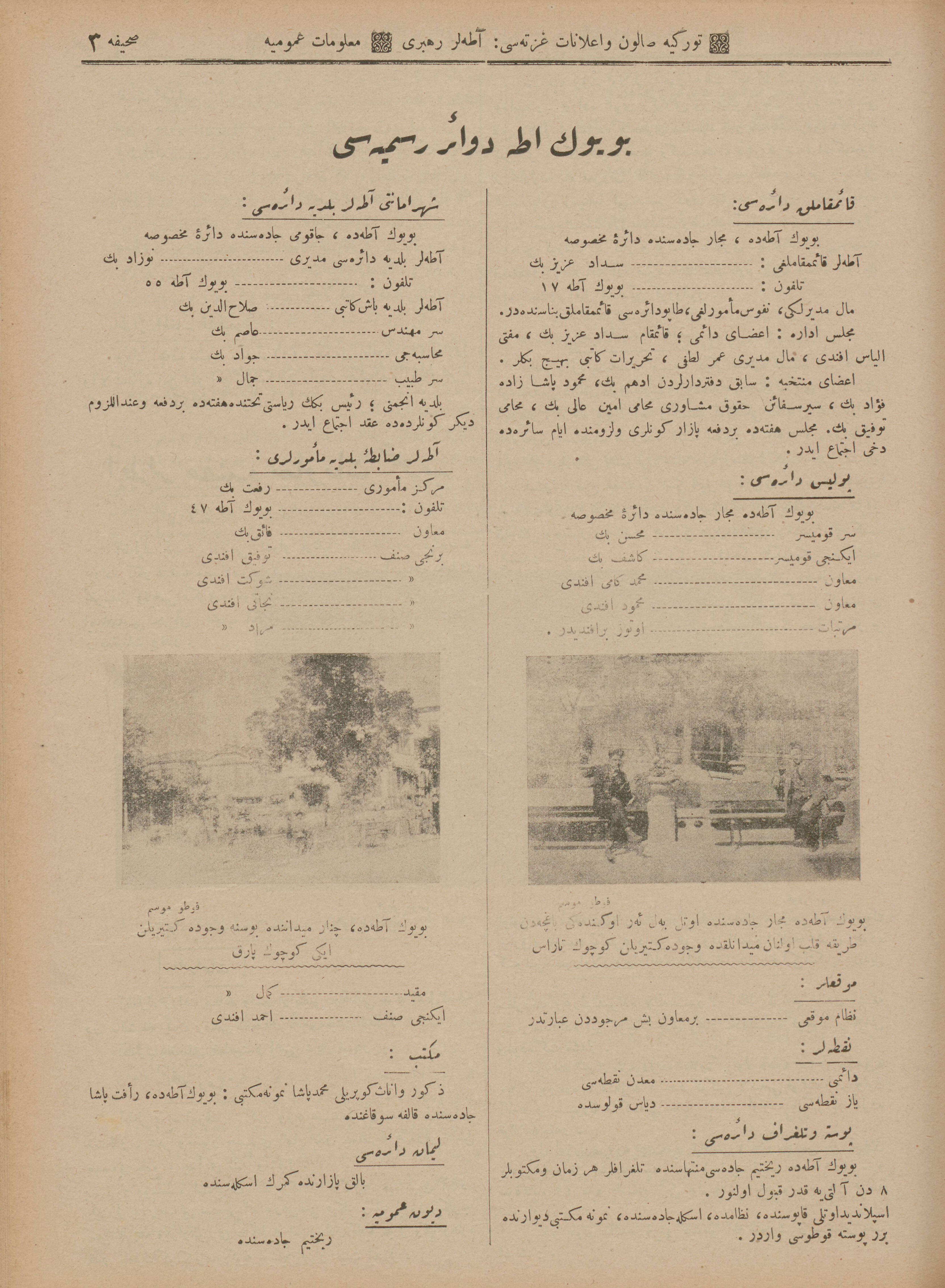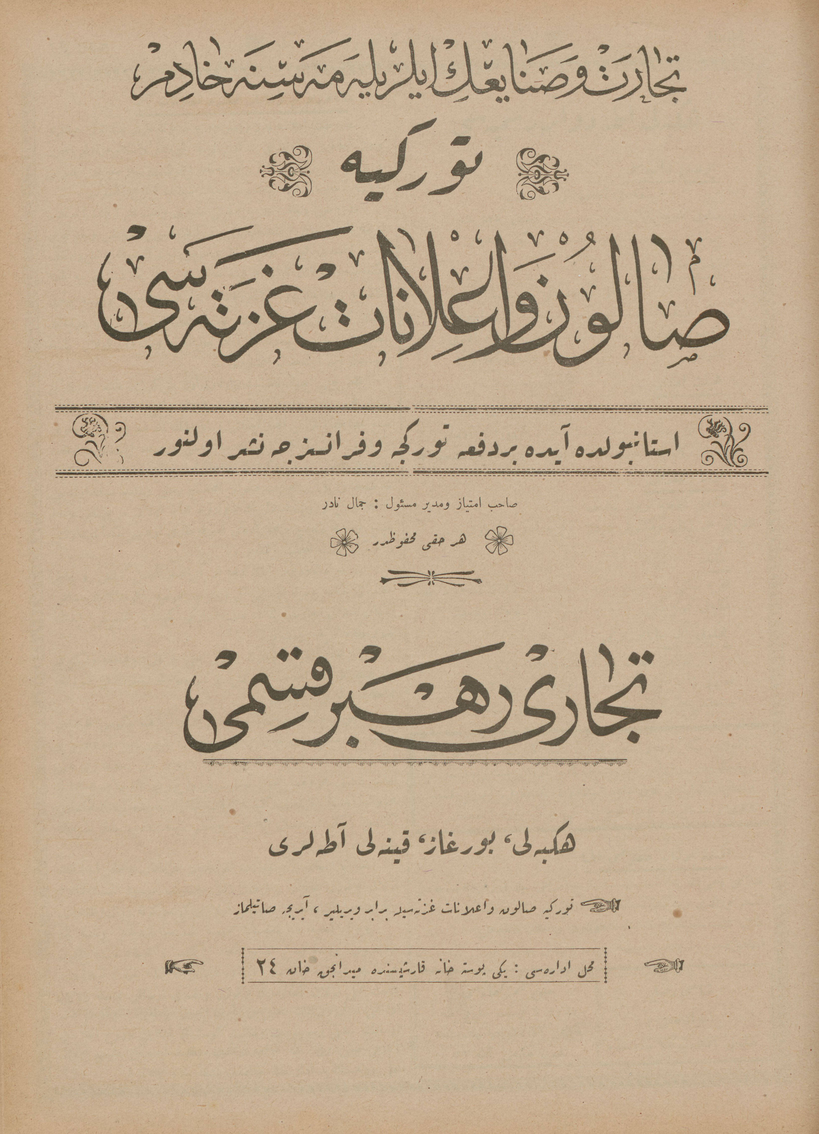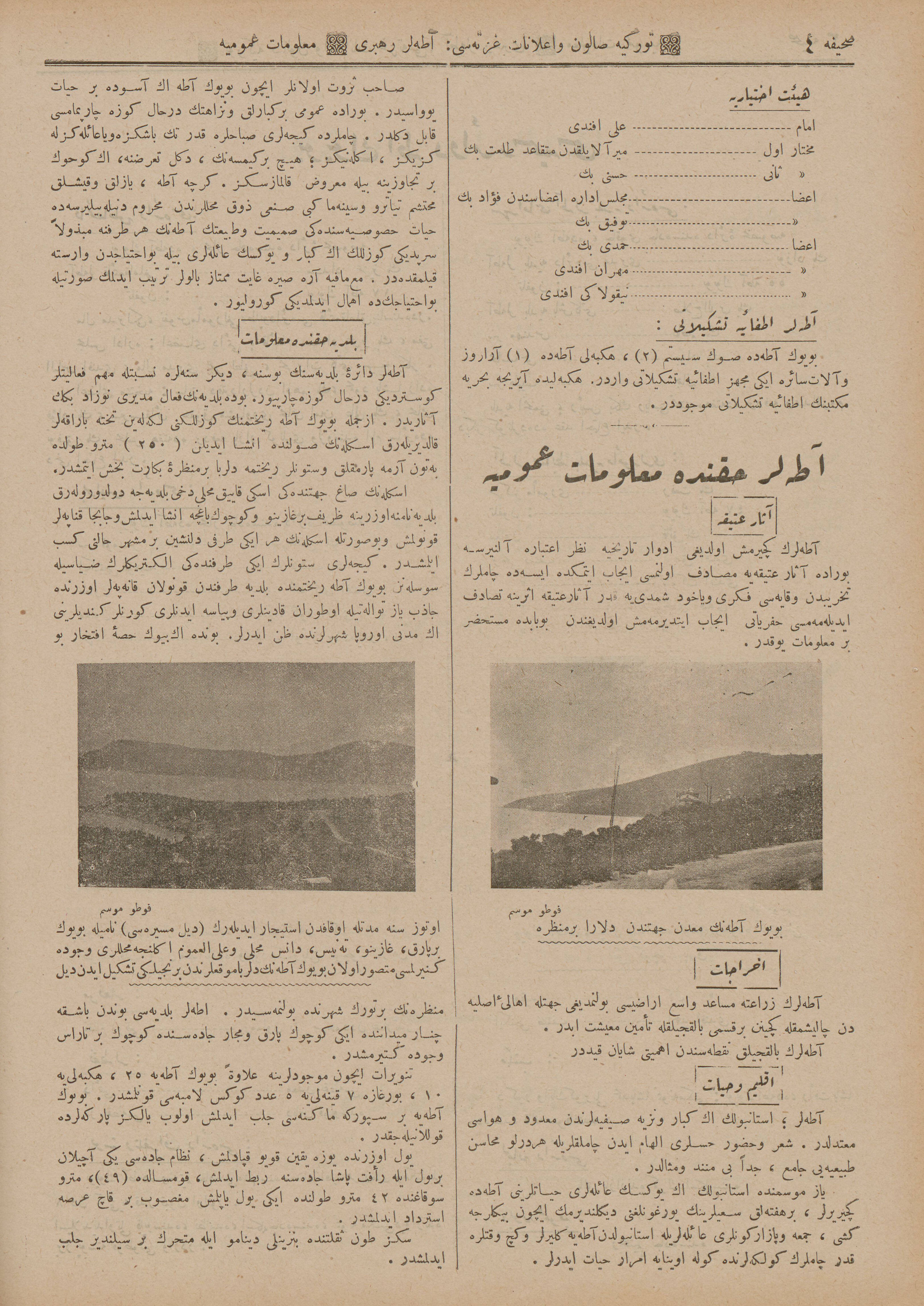 İstanbul’da ayda bir defa Türkçe ve Fransızca neşr olunan Türkiye Salon ve İlanat Gazetesi’nin 1925 (1341) senesinde Mahmud Bey Matbaası’nda basılan Ticaret Rehberi‘nin Adalar kısmında yer alan ticarî müesseselerin îlânlarını takdimle… Adalar Postası Tercüme Heyeti îlânların Osmanlıca ve Fransızca’dan tercümelerini tamamlar tamamlamaz da yayımlamak üzere…