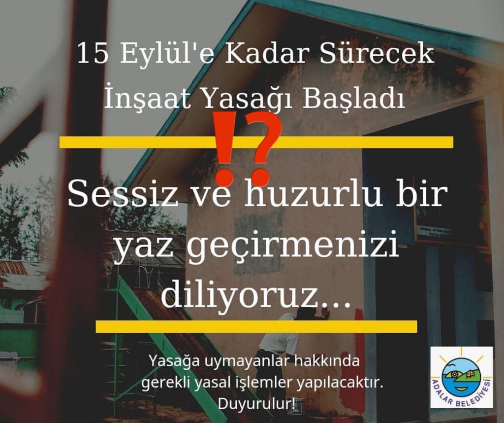 Adalar Belediyesi (15.6.2021): 📢📢📢 15 Eylül’e kadar sürecek inşaat yasağı başladı. Sessiz ve huzurlu bir yaz geçirmenizi diliyoruz…
