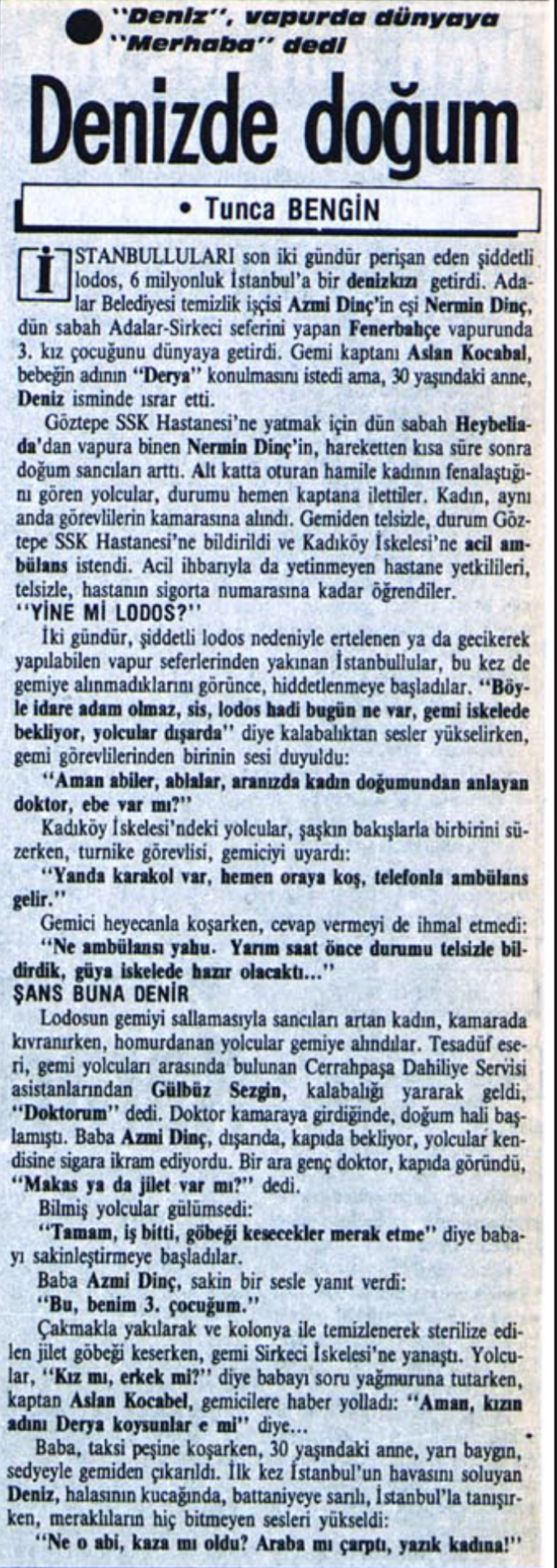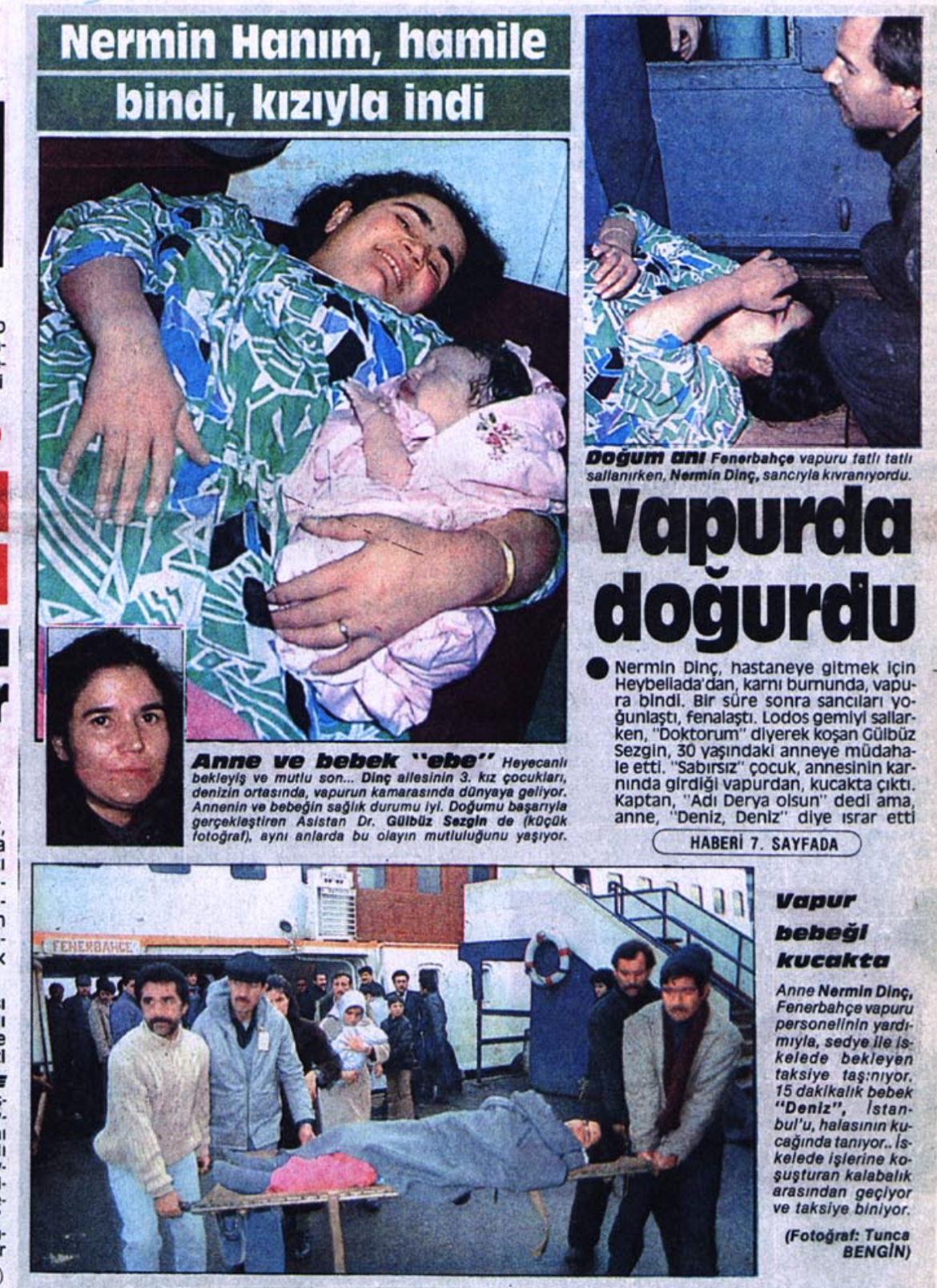 Nermin Dinç, hastaneye gitmek için Heybeliada’dan, karnı burnunda, vapura bindi. Bir süre sonra sancıları yoğunlaştı, fenalaştı. Lodos gemiyi sallarken, “Doktorum” diyerek koşan Gülbüz Sezgin, 30 yaşındaki anneye müdahale etti. “Sabırsız” çocuk, annesinin karnında girdiği vapurdan, kucakta çıktı. Kaptan, “Adı Derya olsun” dedi ama anne, “Deniz, Deniz” diye ısrar etti.