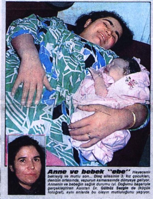 Heyecanlı bekleyiş ve mutlu son… Dinç ailesinin 3. kız çocukları, denizin ortasında, vapurun kamarasında dünyaya geliyor. Annenin ve bebeğin sağlık durumu iyi. Doğumu başarıyla gerçekleştiren Asistan Dr. Gülbüz Sezgin de (küçük fotoğraf), aynı anlarda bu olayın mutluluğunu yaşıyor.