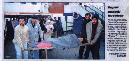 Göztepe SSK Hastanesi’ne yatmak için dün sabah Heybeliada’dan vapura binen Nermin Dinç’in, hareketten kısa süre sonra doğum sancıları arttı. Alt katta oturan hamile kadının fenalaştığını gören yolcular durumu hemen kaptana ilettiler. Kadın aynı anda görevlilerin kamarasına alındı. Gemiden telsizle durum Göztepe SSK Hastanesi’ne bildirildi ve Kadıköy İskelesi’ne acil ambulans istendi. Acil ihbarıyla da yetinmeyen hastane yetkilileri, telsizle hastanın sigorta numarasına kadar öğrendiler.