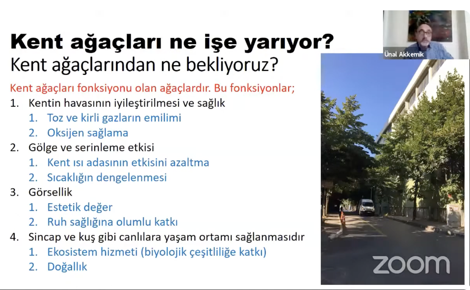 Kent ağaçları kentin havasını iyileştirmek ve sağlık fonksiyonu var ki bu özellikle kişi başına düşen yeşil alan miktarı açısından baktığımızda İstanbul zaten çok gerilerde kalıyor, 7 metrekare civarında bir rakam var son zamanlarda […] Dolayısıyla kentteki ağaçların sayısı zaten yetersiz, yeşil alan miktarı zaten yetersiz, bir de bunların budandığını düşünün o zaman tabii ki bu fonksiyonu yerine getirme şansı kalmıyor. Nedir bu fonksiyon? Toz ve kirli gazların emilmesi ve kente oksijen sağlaması. Dolayısıyla bu fonksiyonlarını yerine getirebilmesi için ağaçların gelişimlerinin de tepelerinin de sağlıklı olması gerekiyor.