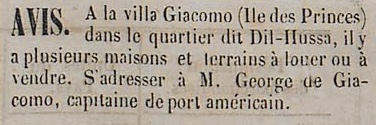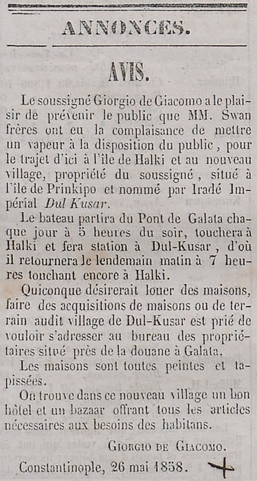 Bay Georgio di Giacomo, halkı bilgilendirmekten onur duyar ki, Prinkipo Adası’nda [Büyükada] yer alan Dul-Kusar [Dil-güşâ: gönül açan, gönüle ferahlık veren] adlı yeni mahallede kiralık ve satılık birkaç güzel ev ile satılık arsalar mevcuttur; üstelik fiyatlar oldukça uygundur.
