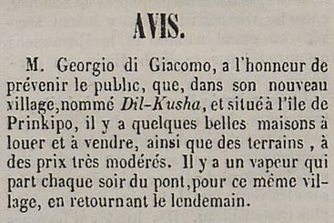 Bay Georgio di Giacomo, halkı bilgilendirmekten onur duyar ki, Prinkipo Adası’nda [Büyükada] bulunan Dil-Kusha [Dil-güşâ: gönül açan, gönüle ferahlık veren] adlı yeni yerleşim yerinde, kiralık ve satılık birkaç güzel ev ile arsalar mevcuttur; hem de oldukça uygun fiyatlarla.