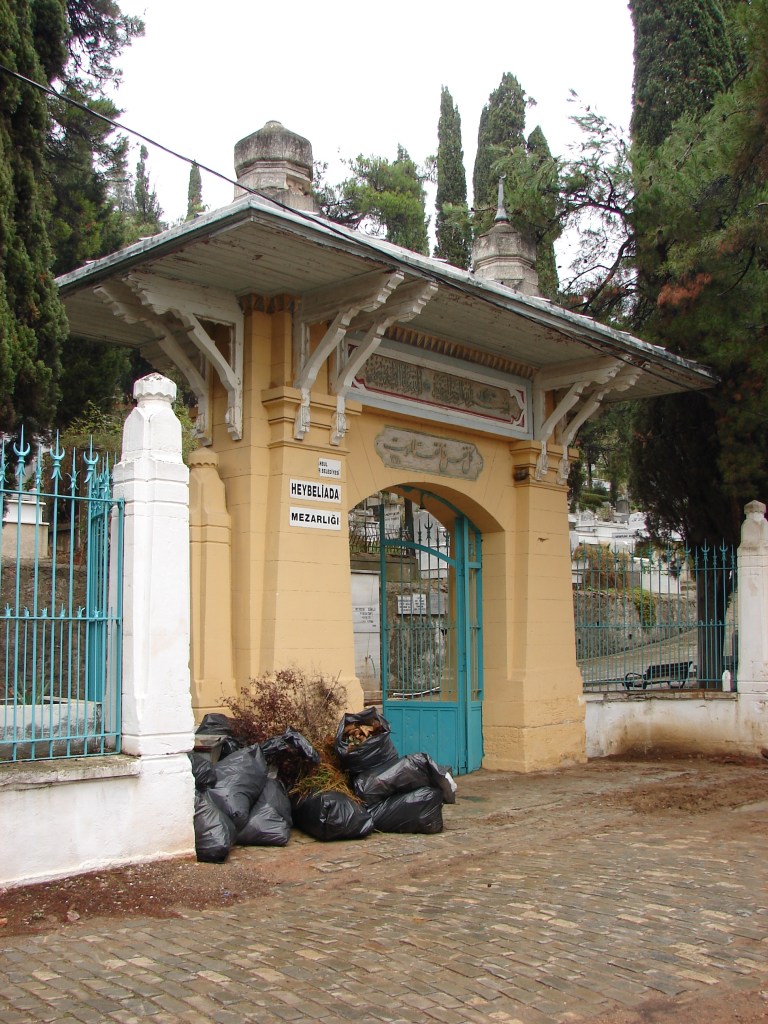 Bugünkü Müslüman mezarlığı, Değirmen Tepesi’nin güneyinden geçen yolun üst yamacında, Bahriye Mektebi binalarını ve devamında uzanan Ay’ Yorgi —Uçurum— Manastırı’na ait yapılar grubunu geçtikten sonra dağa doğru kıvrılan yolun sağında yer alıyor. Hemen bitişiğinde ise aşağı-yukarı aynı büyüklükte bir Rum mezarlığı var. Rum mezarlığı 1902, İslam kabristanı ise 1911 yılında hizmete girmiş. Bu tarihten evvel ise Heybeliadalı Müslümanlar merkez mahallenin hemen yukarısında, evlerin çamlığa vardığı yamaca defnediliyormuş. Burada, yaklaşık 115 yıl evvel terk edilmiş olan ilk ada mezarlığına dair kalıntılar göze çarpıyor. Artık altlarına arı kovanlarının yerleştirildiği çam ağaçlarının aralarına dikkatle bakıldığında sağa sola dağılmış 19. yüzyıldan kalma mermer mezar taşlarını seçebilmek mümkün.