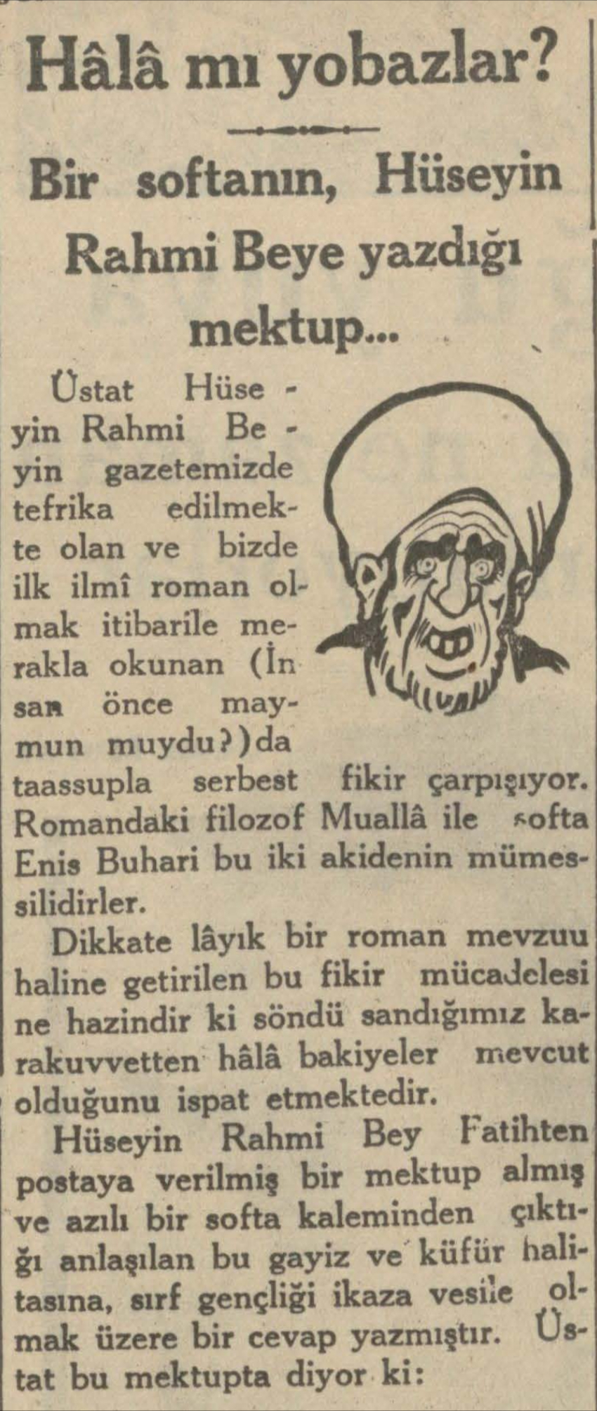Yazarın 161. doğum günü vesilesiyle, bendeki evrakı arasında senelerdir durup duran ve günün anlam ve önemine dair olduğunu düşündüğüm bir mektubu aklıma geldi, zarfından çıkarttım, tekrar okudum. 4 Ekim 1934 tarihinde, Cumhuriyet gazetesinin yazı işleri müdürü Feridun Osman Bey’e (Menteşoğlu, 1904-1958) hitaben, o sırada gazetede tefrika edilen İnsan Önce Maymun muydu? isimli romanını hedef alan eleştiriye karşılık olarak kaleme aldığı mektubunda yazar şöyle diyor: