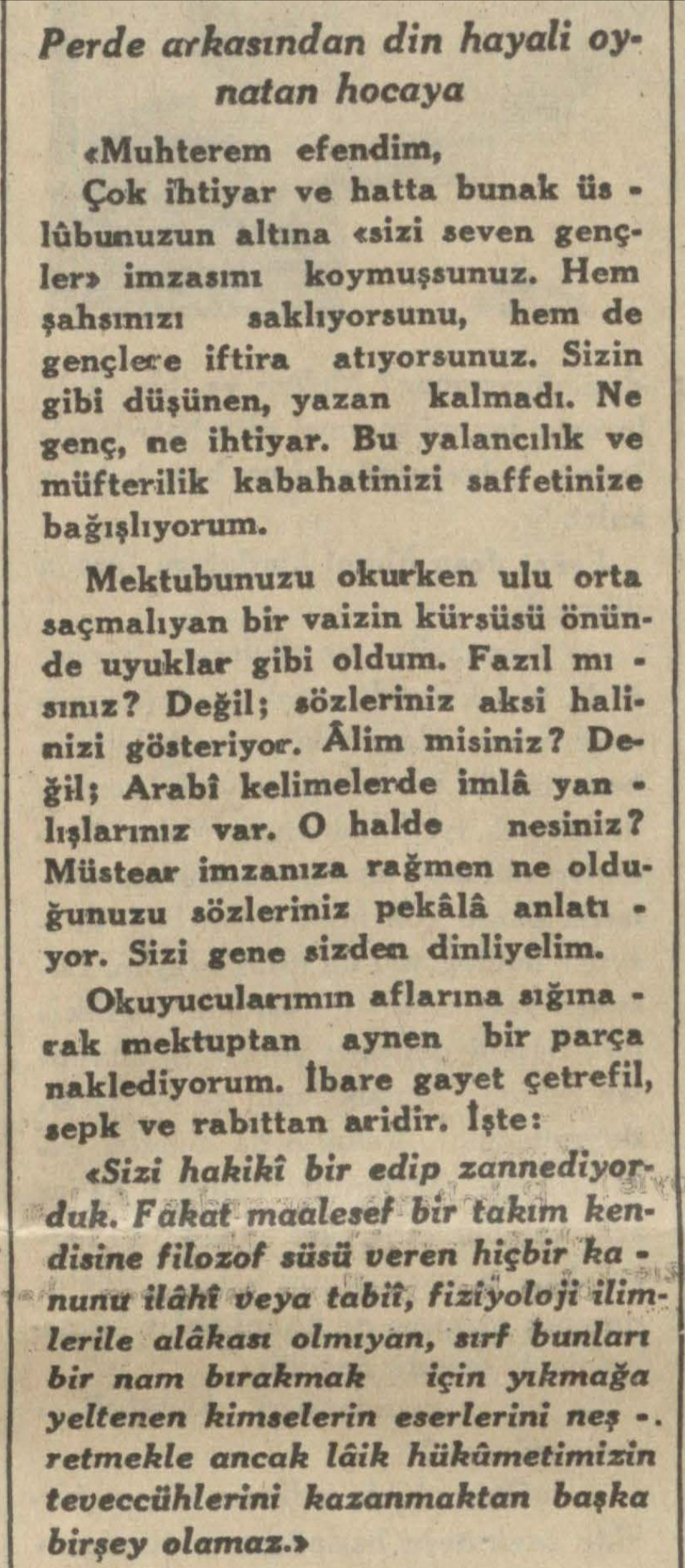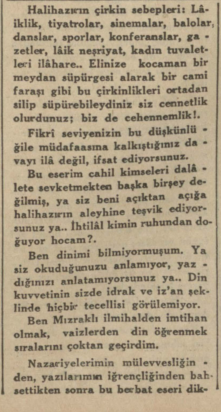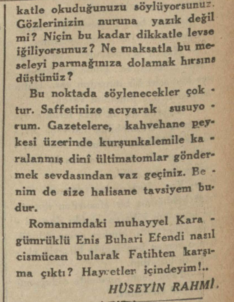 “Muhterem beyefendi hazretler, yazdığım romanda yobazın biri bir (…) gibi endamıyla kendini görerek öfkelenmiş, bir hezeyannâme karalamış, göndermiş. Bu kara kuvvetin henüz kökü kesilmedi. Bunlar köşeye bucağa sinerek zehirli çatal dillerini göstermek için fırsat bekliyorlar. Herife layık olduğu cevabı verdim. Tazimâtımla beraber huzurunuza takdim ediyorum.”